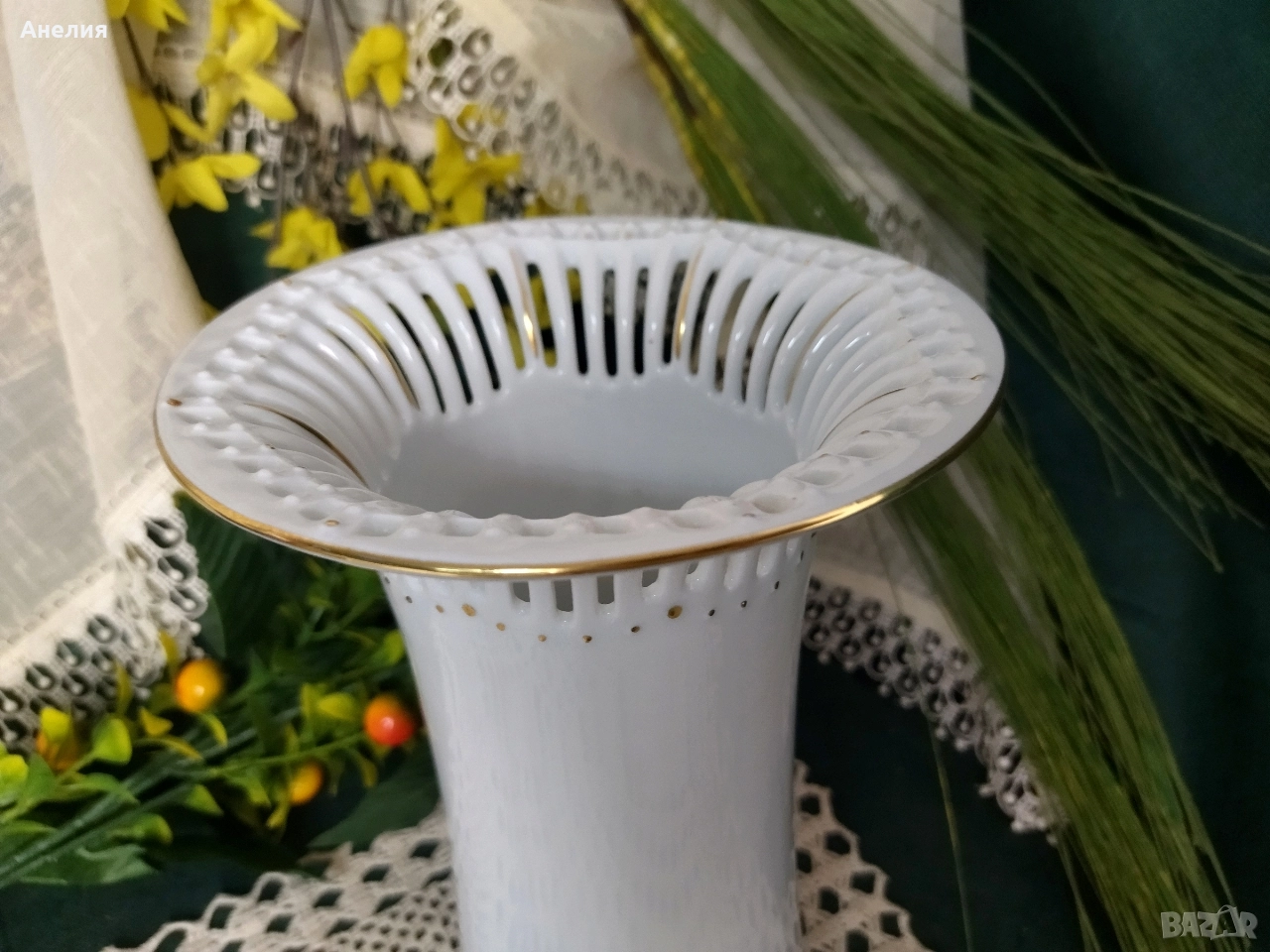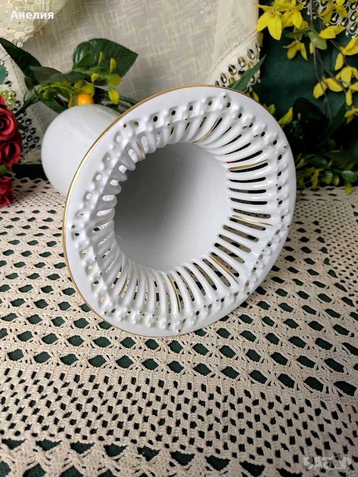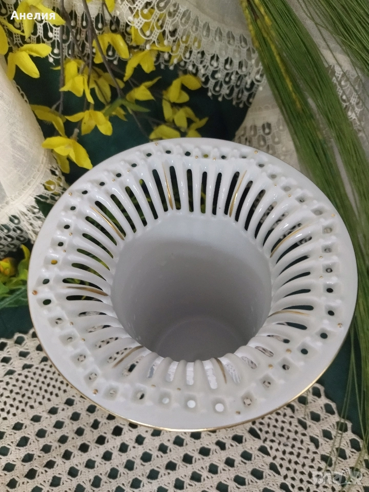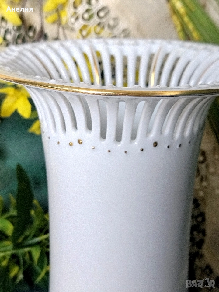 Вазата с бяла , мрежеста (ажурна) структура по горния ръб и деликатни златни акценти.
