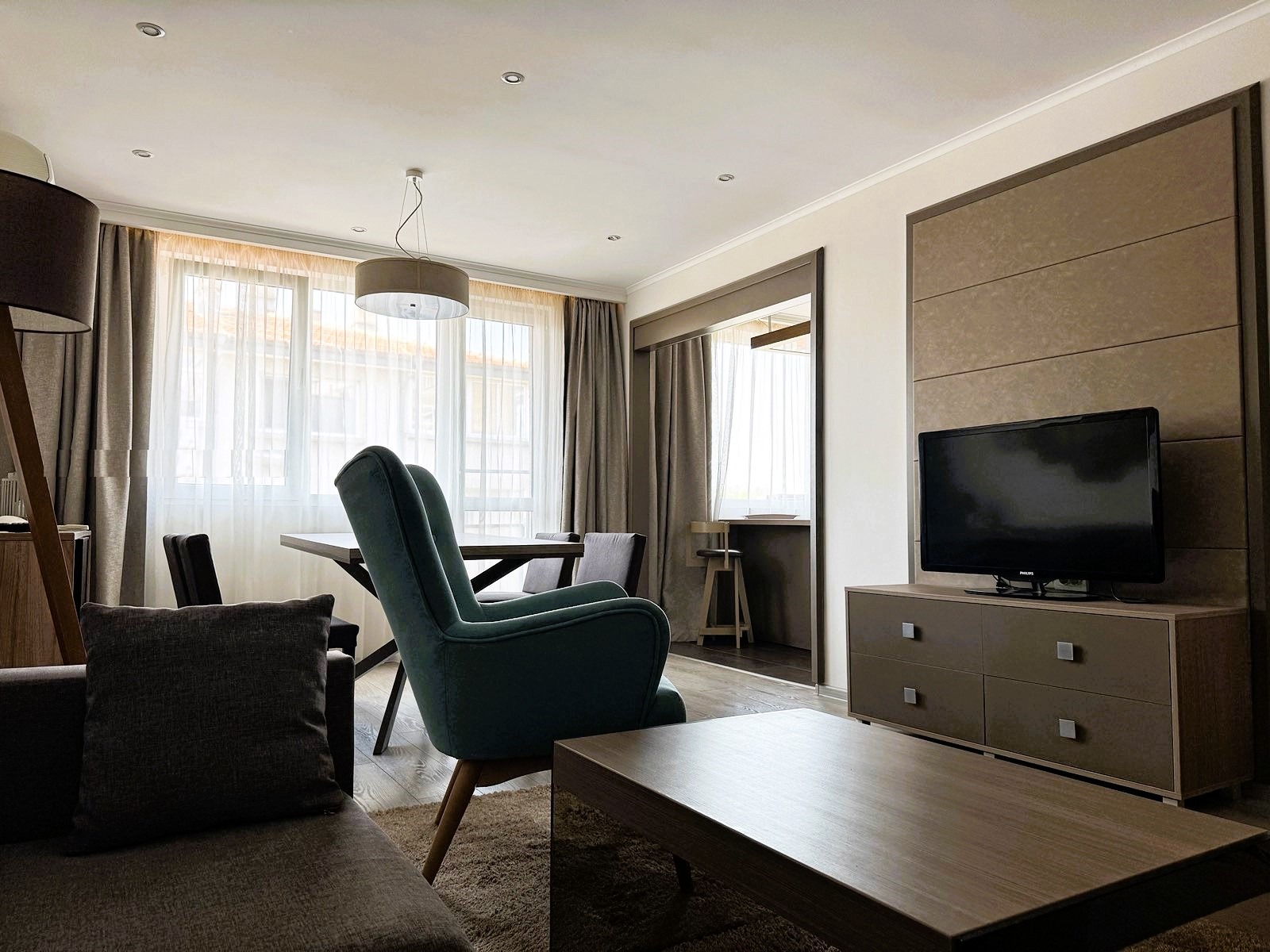 Отоплението и охлаждането са с висок клас енергоефективни климатици във всяка стая. Апартаментът разполага с TV и цялостно модерно обзавеждане.