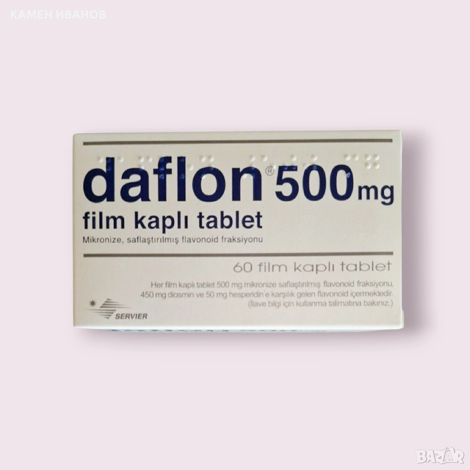 НАЛИЧЕН: ДАФЛОН 500 мг. 60 ТАБЛЕТКИ. Подобрява венозния тонус и устойчивостта на малките кръвоносни съдове. Дафлон е венотоник (повишава венозния тонус) и вазопротектор (повишава устойчивостта на малките кръвоносни съдове). Дафлон се препоръчва за симптоматично лечение на венозно-съдови нарушения (отекли крака, болка, изморени крака) и за симптоматично лечение при остри хемороидални кризи. Как се използва: При венозна недостатъчност – две таблетки дневно – по една таблетка на обяд и вечер, по време на хранене; При хемороиди – 4-дневен курс от 6 таблетки дневно, последвани от по 4 таблетки дневно през следващите 3 дни, по време на хранене. Произведен в Турция. Годно до 06.2028г. Изпращам с Еконт или Спиди