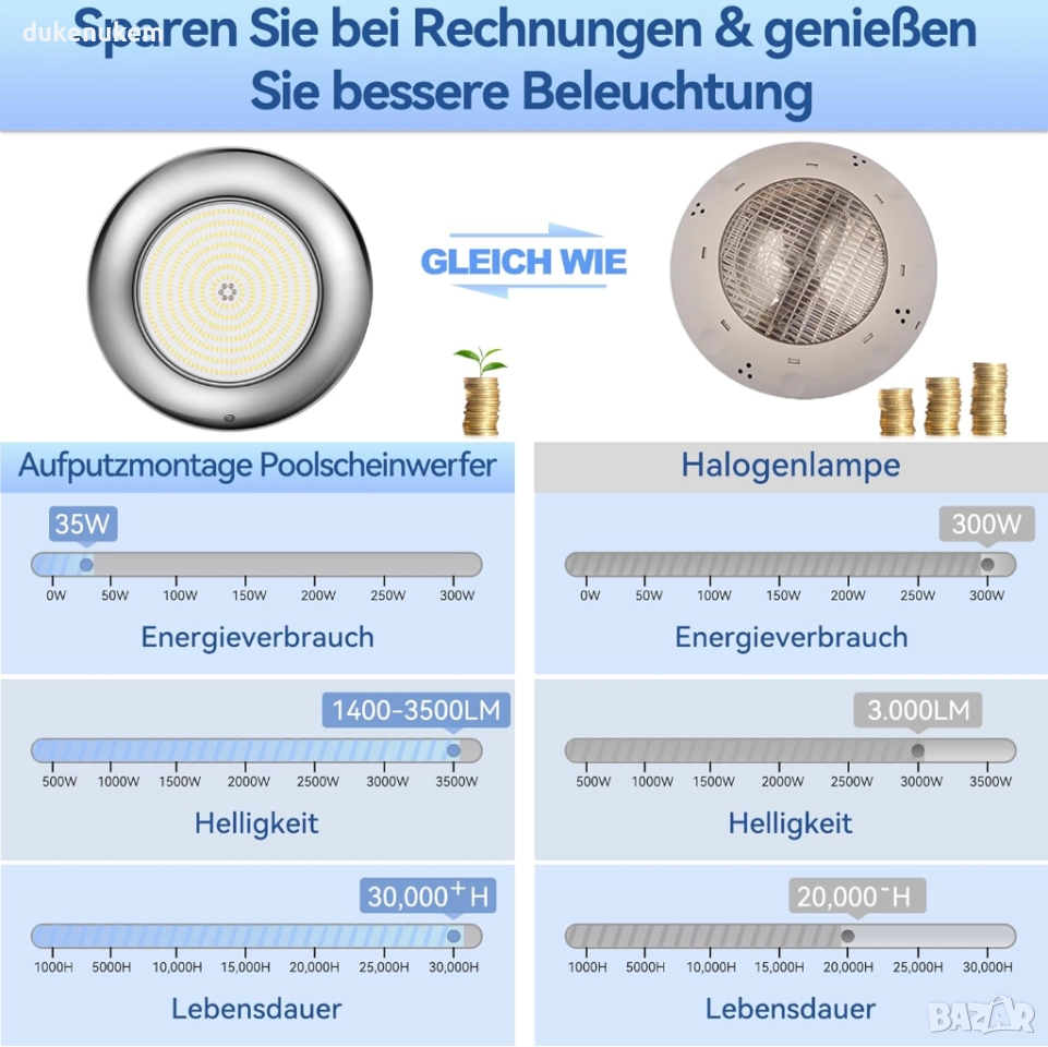 Осигурява широко и равномерно осветяване на басейни, спа и декоративни водни площи.