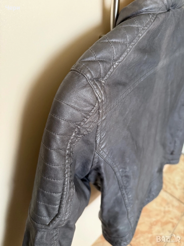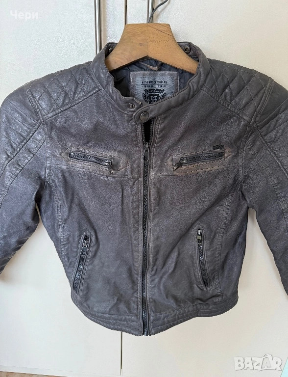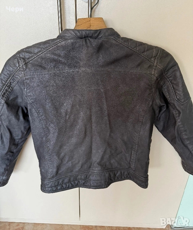 Детско сиво кожено яке за момче, размер 152. Цветът около горните джобчета е леко изсветлял, но якето иначе е в добро състояние.