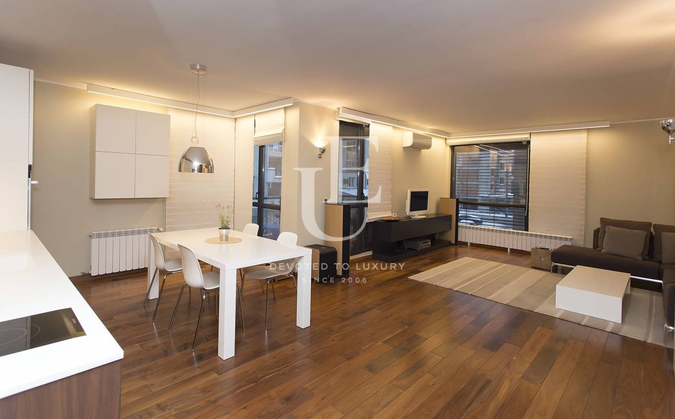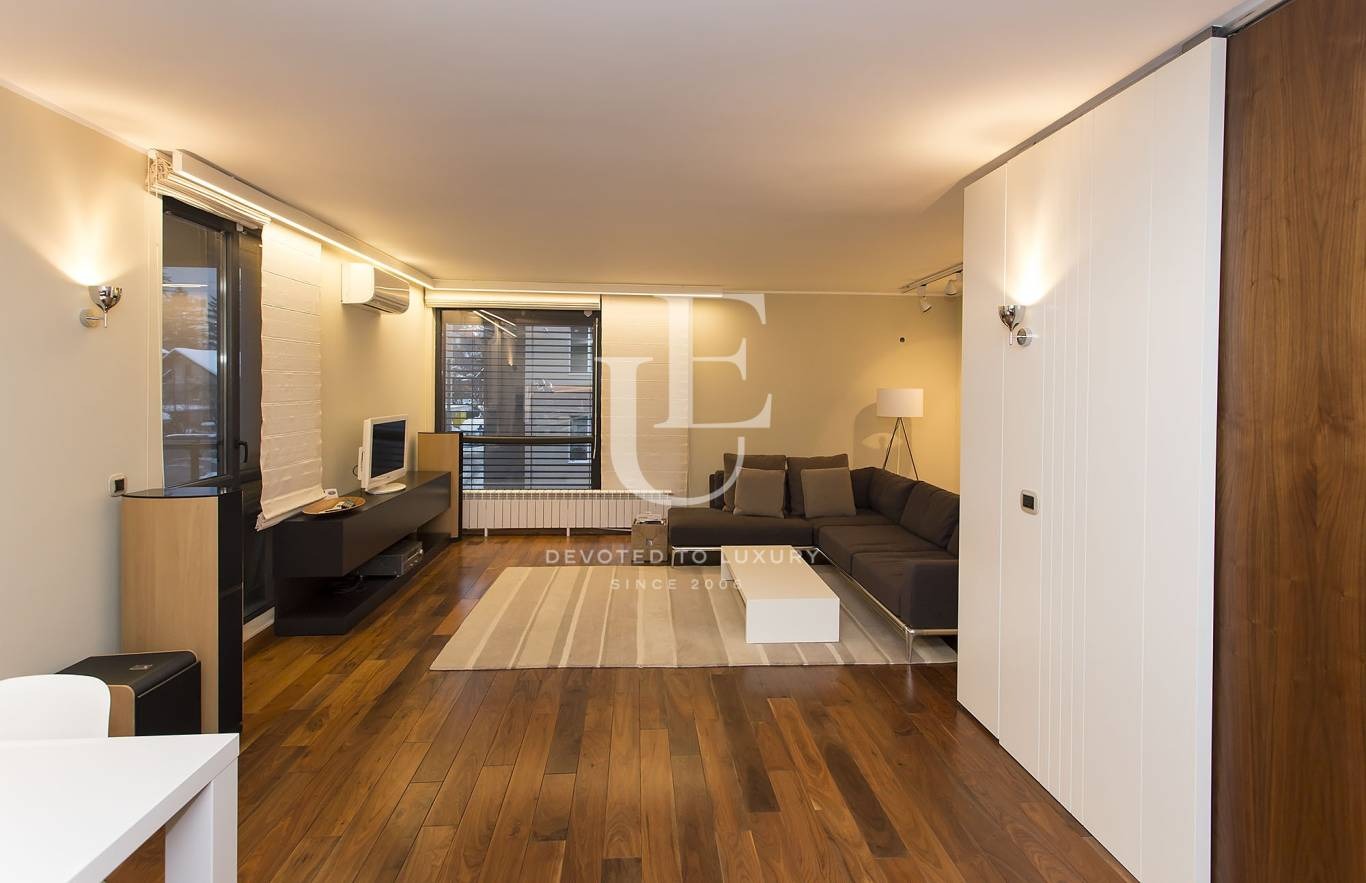 Жилището е обзаведено по дизайнерски проект, изпълнен с внимание към детайла. Използвани са висококачествени материали - естествени, скъпи и подбрани в натурални, меки тонове. За максимален комфорт са предвидени множество вградени шкафове и гардероби. Имотът е използван, но е в отлично състояние.