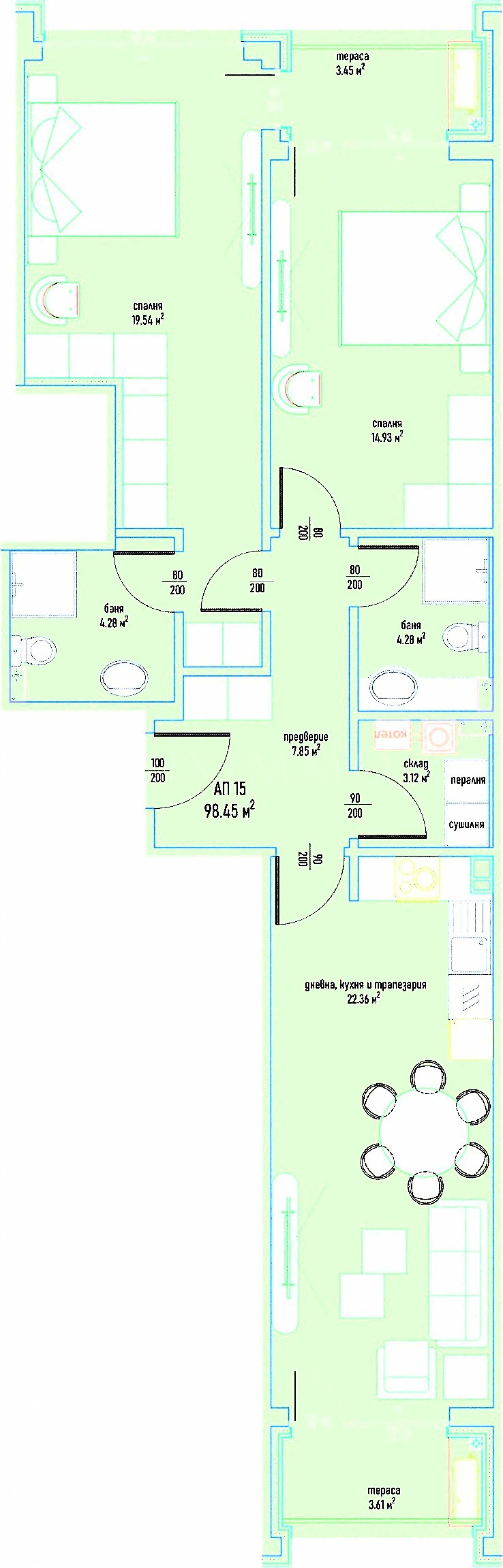 Апартаментът е тристаен, с обща площ 115.56 кв.м (нетна площ 98.45 кв.м + общи части 17.11 кв.м) и е разположен на четвърти етаж.
