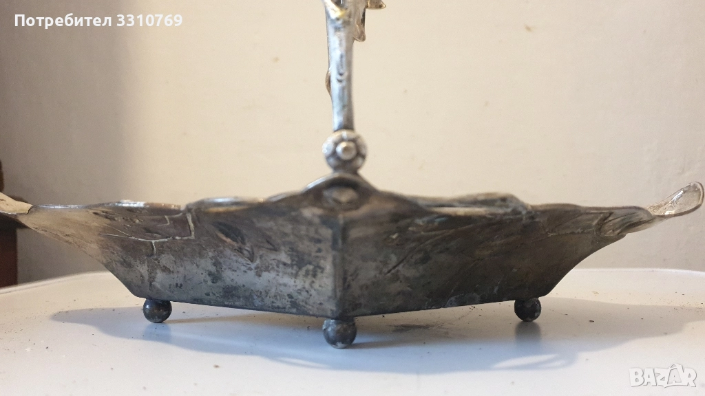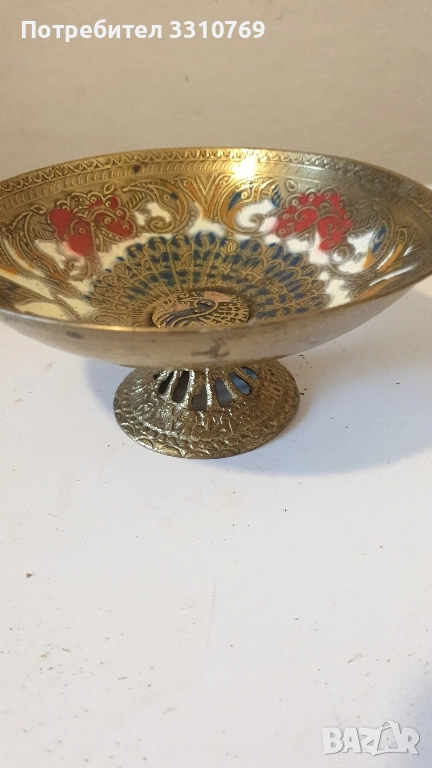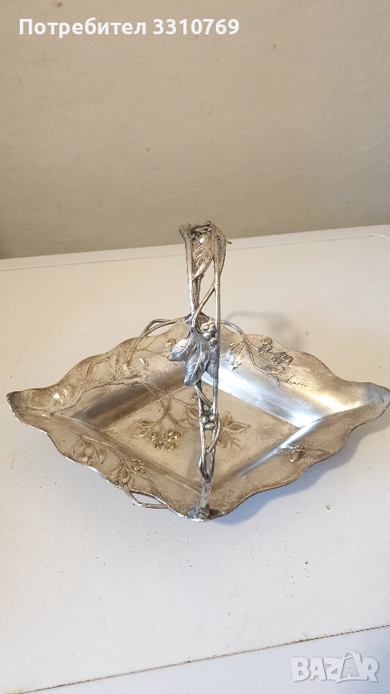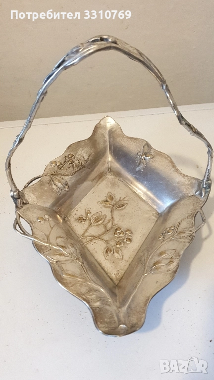Бонбониера 3-порцелан, Н=18см.Д=23см.Ш=15см.Ц=35лв.печат Басано. Фруктиера 4-бронз, Н=11см.Д=22см.Ш=15см.Ц=60лв.на три крачета. Фруктиера 5-посребрена кошничка, Н=21см.,Д=30 см.,Ш=20см.,Ц=300лв. фирма WMF GERMANY. (.печат в основата на дръжката) Фруктиера 6-посребрена купа върху подложна чиния, Н=11см.Д=16см. Ц=45лв.,без печат. Фруктиера 7-посребрена, върху три крачета,Н=4см.,Д=18см.. Ц=10лв.,без печат. Фруктиера 8- бронз, Н=8. см.,Д=17,5см.,Ц=25лв. украшение с клетъчен емайл . За колекционери и ценители на красотата на редки антикварни художествени изделия!
