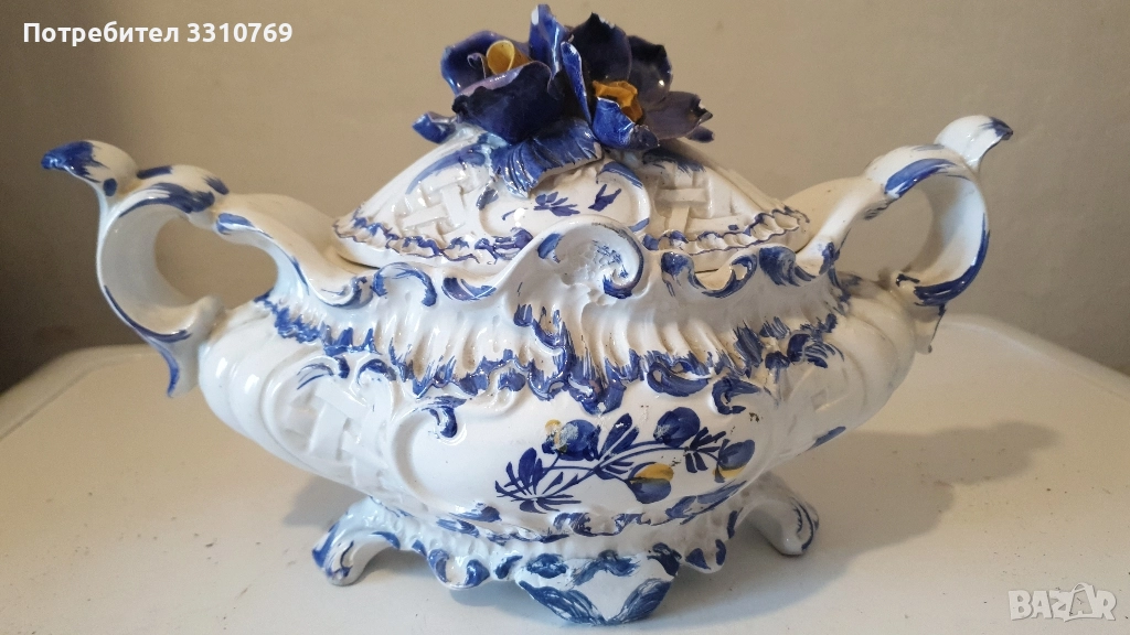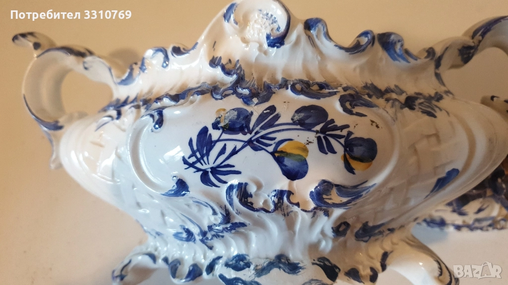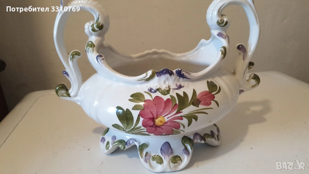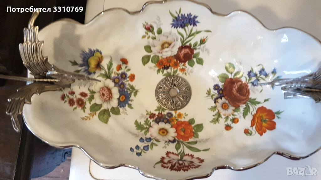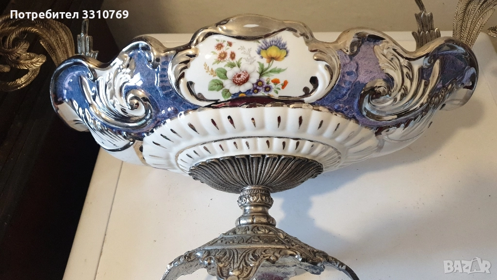 Фруктиера1-порцеланова с метална основа и посребрени птици за декорация, височина Н=32см.дължинаД=65см.,ширина Ш=24см.,цена. Ц=535лв.стил"SEVRE"от 19век, произведена в манифактура за художествен порцелан Флоренция, Италия. Жардениера 2-порцелан, Н=18см.Д=28см.Ш=15смЦ=120лв.(с реставрация на краче)печат Басано.