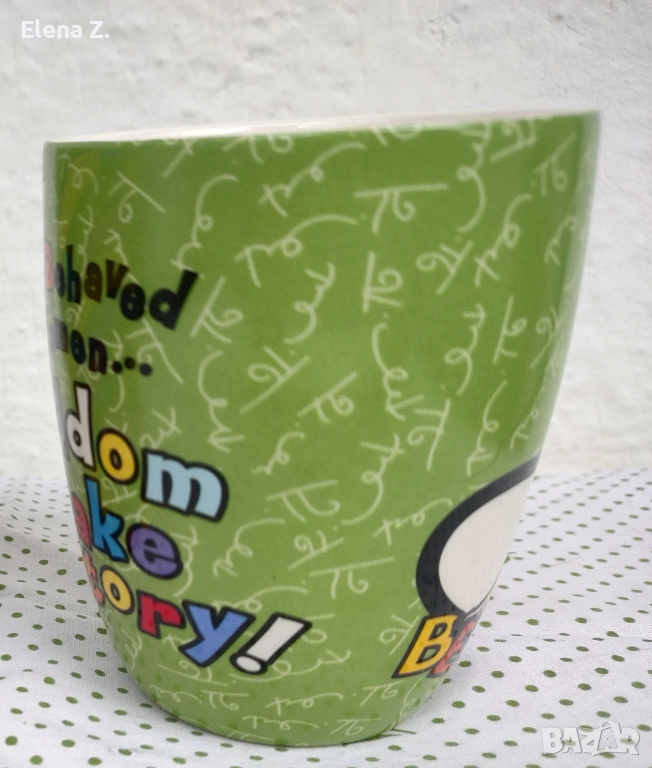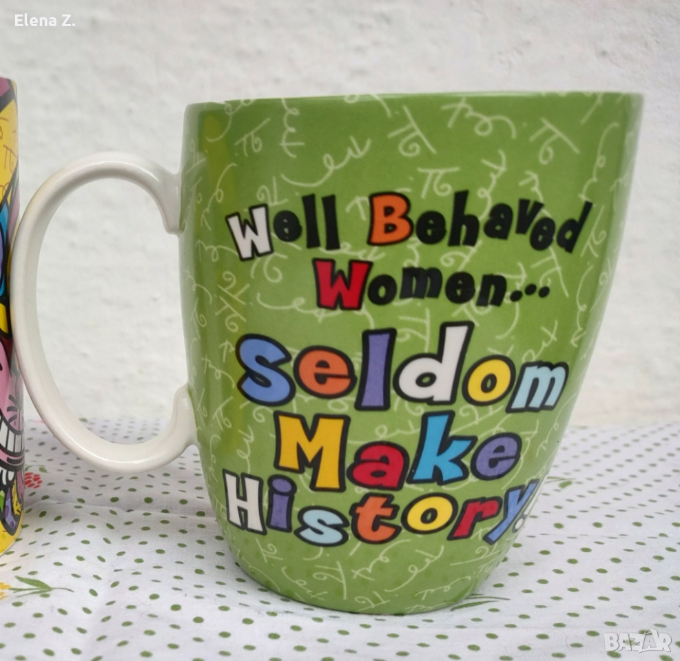 Има от едната страна хумористичен надпис, че “добре държащите се жени рядко влизат в историята.”