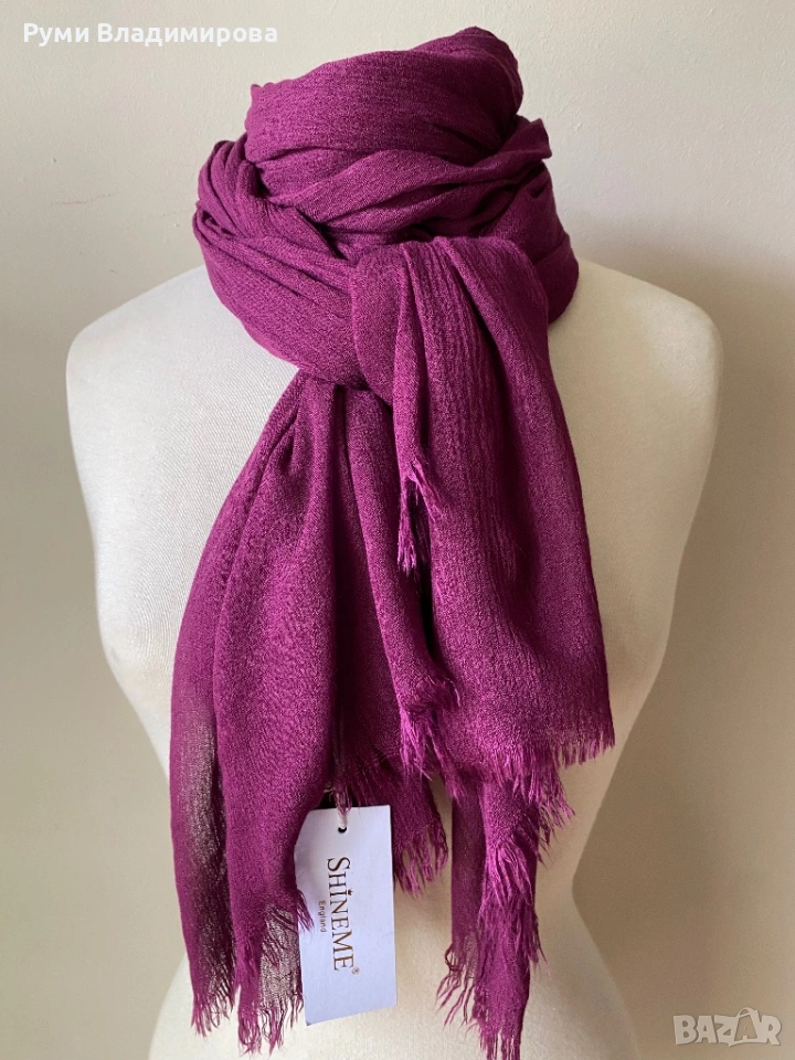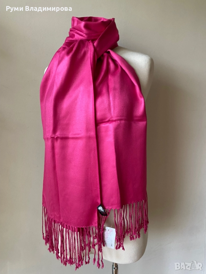 Шал в цикламено, розов цвят с ресни, с етикет, състав 100 % вискоза, мека, лека и лъскава материя, нов, за една по-цветна визия! Доставка с Еконт.