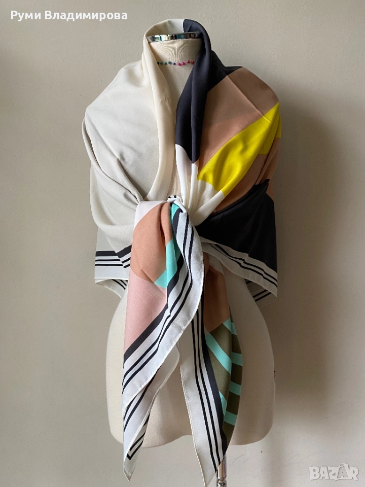 Голям, квадратен шал НМ, в светло синьо, лайм зелено, бледо розово, каки, размер 130 Х 130 см, с етикет, нов, 100 % полиестер, мека, непрозрачна материя, доставка с Еконт.