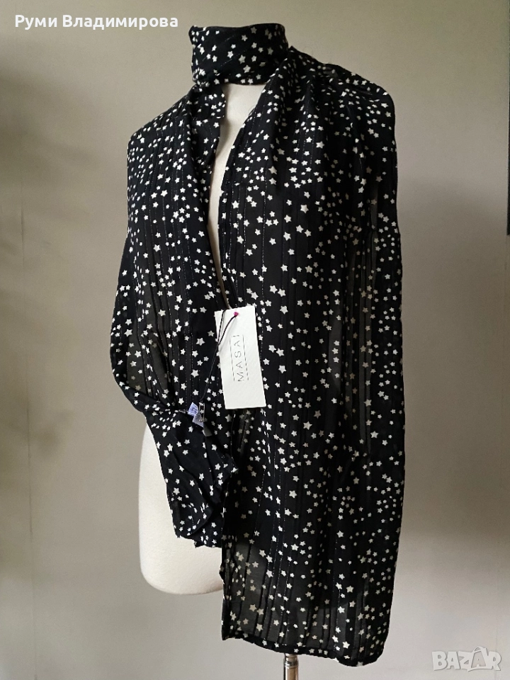 Черен шал Masai, с етикет от 98 % вискоза и 2 % метални нишки, с етикет цената на него е 29 €, на бели звездички и блестящи райета, много, фина материя, подходящ за официален тоалет, нов, доставка с Еконт.