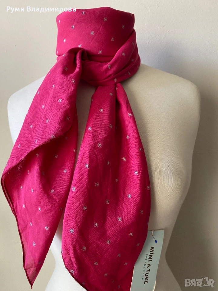 Розов шал от 100 % памук, Miniature Copenhagen, с етикет, десен на малки бели звездички, тънка, деликатна материя, квадратен размер, подходящ и като