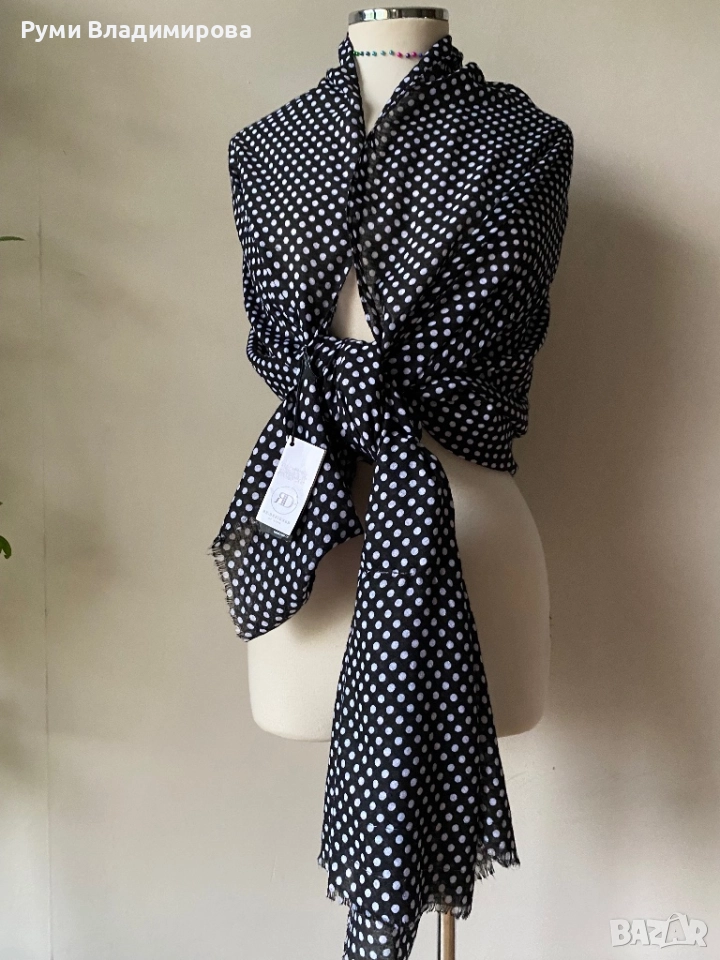 Черен шал на бели точки, Re: designed by Dixie, с етикет, датска марка, голям размер, 100 % вискоза, нов, доставка с Еконт, за любители на точките.