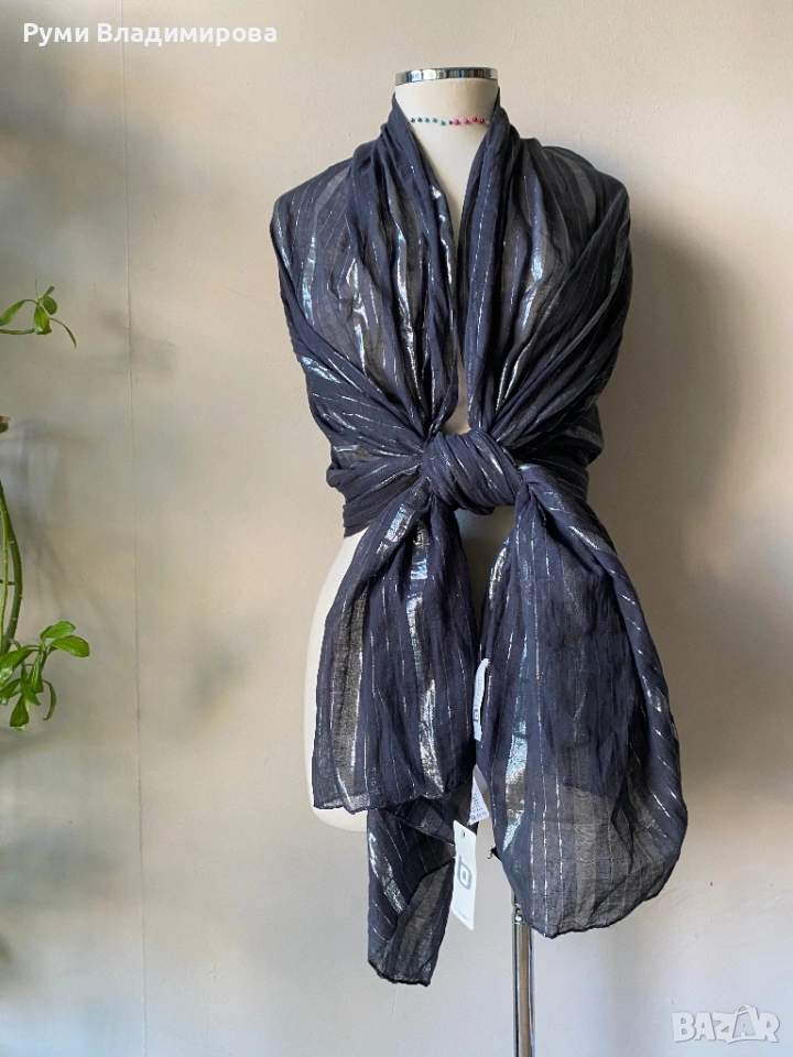 Черен шал Marina Militare с 50 % вълна и 50 % акрил , с етикет, италиански бранд, материя тип плетиво с вплетена тънка сребриста нишка, която придава блясък на шала, много ефектен, нов, доставка с Еконт.