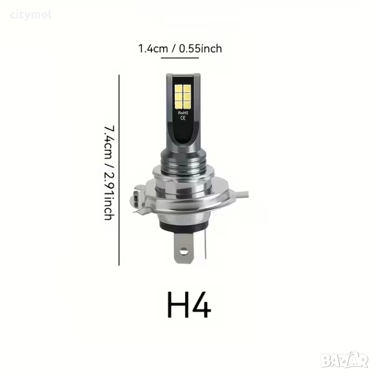 Пакетът включва: 2x LED H4 лампи/крушки с по 12 SMD 3030 диода за фарове.