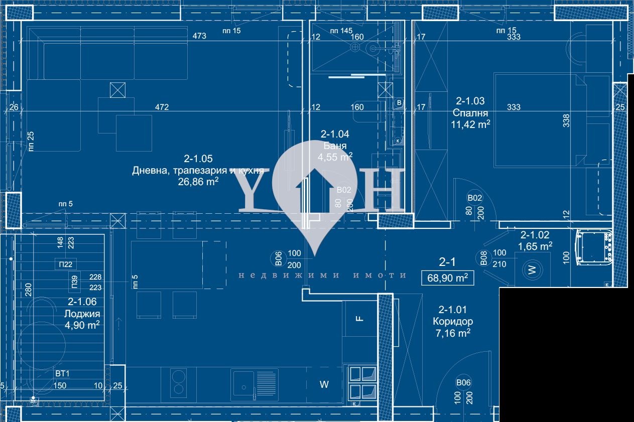 Двустаен апартамент, разположен на 2-ти етаж на сграда В. Имотът се състои от: