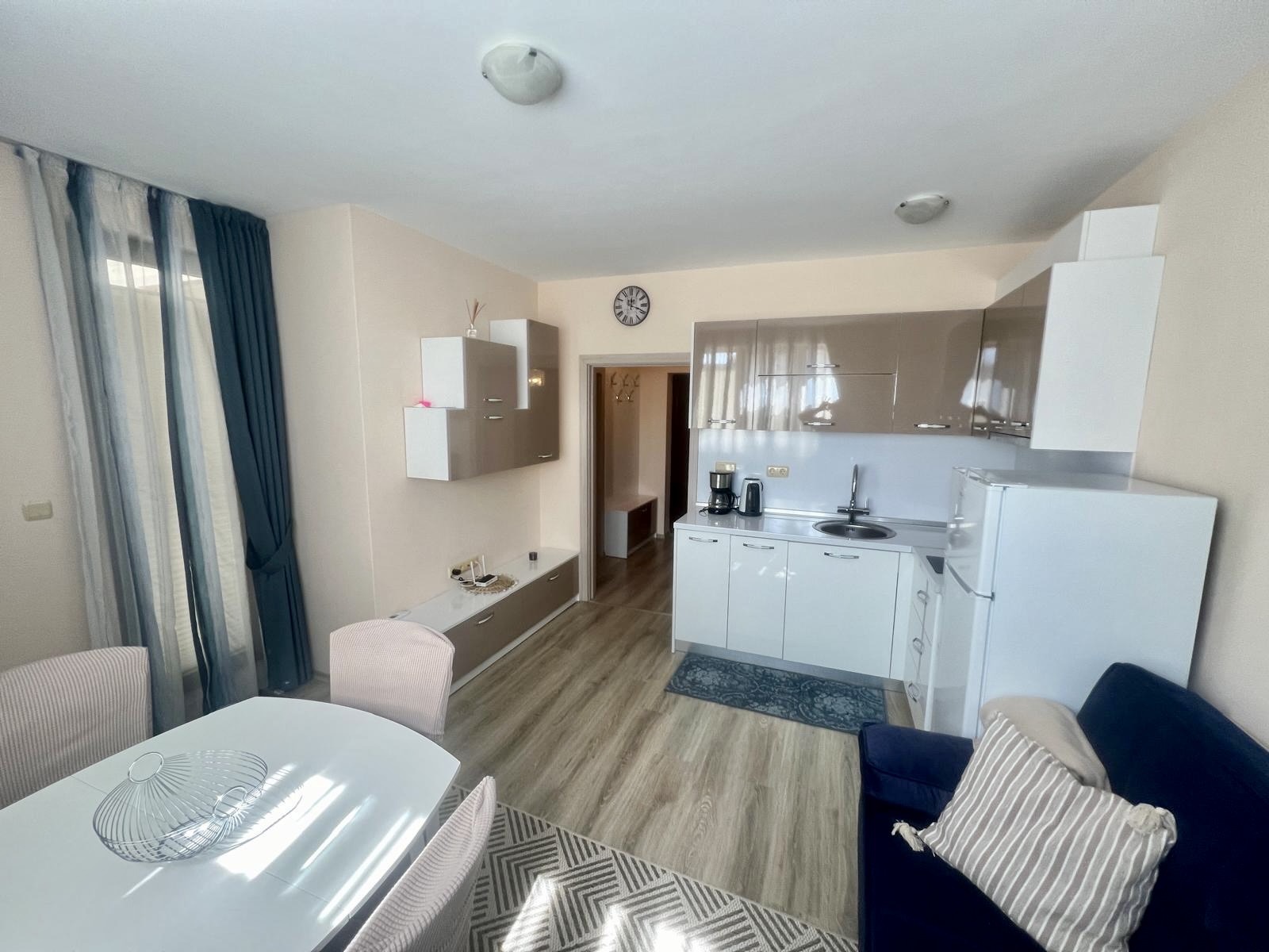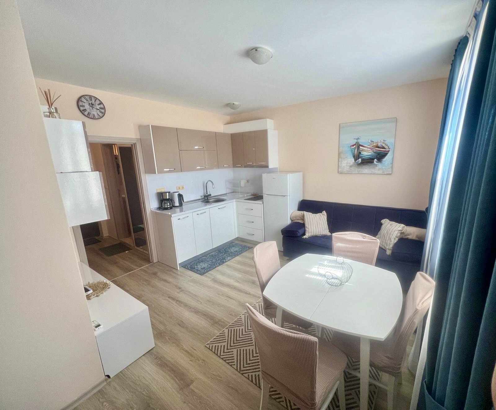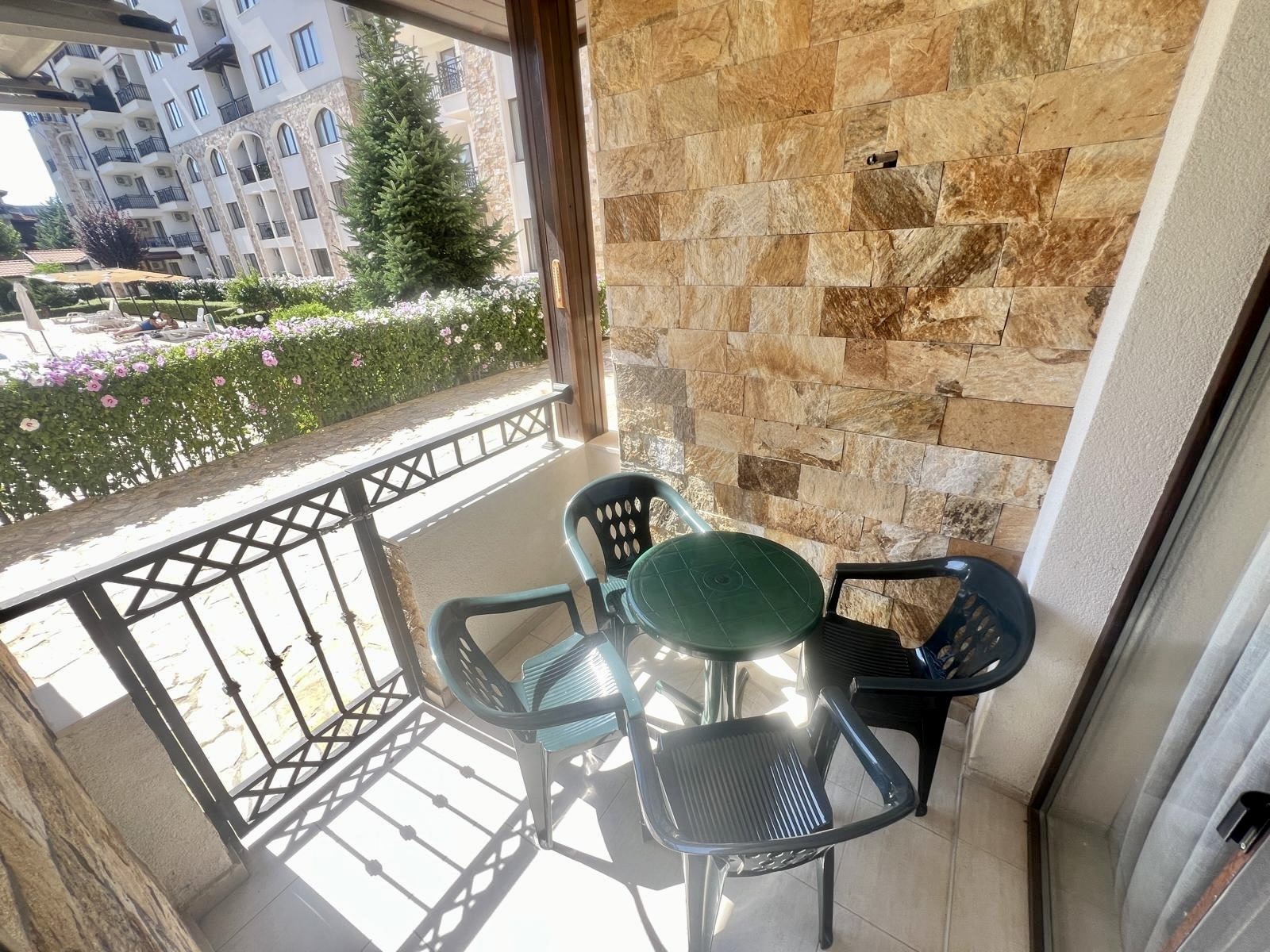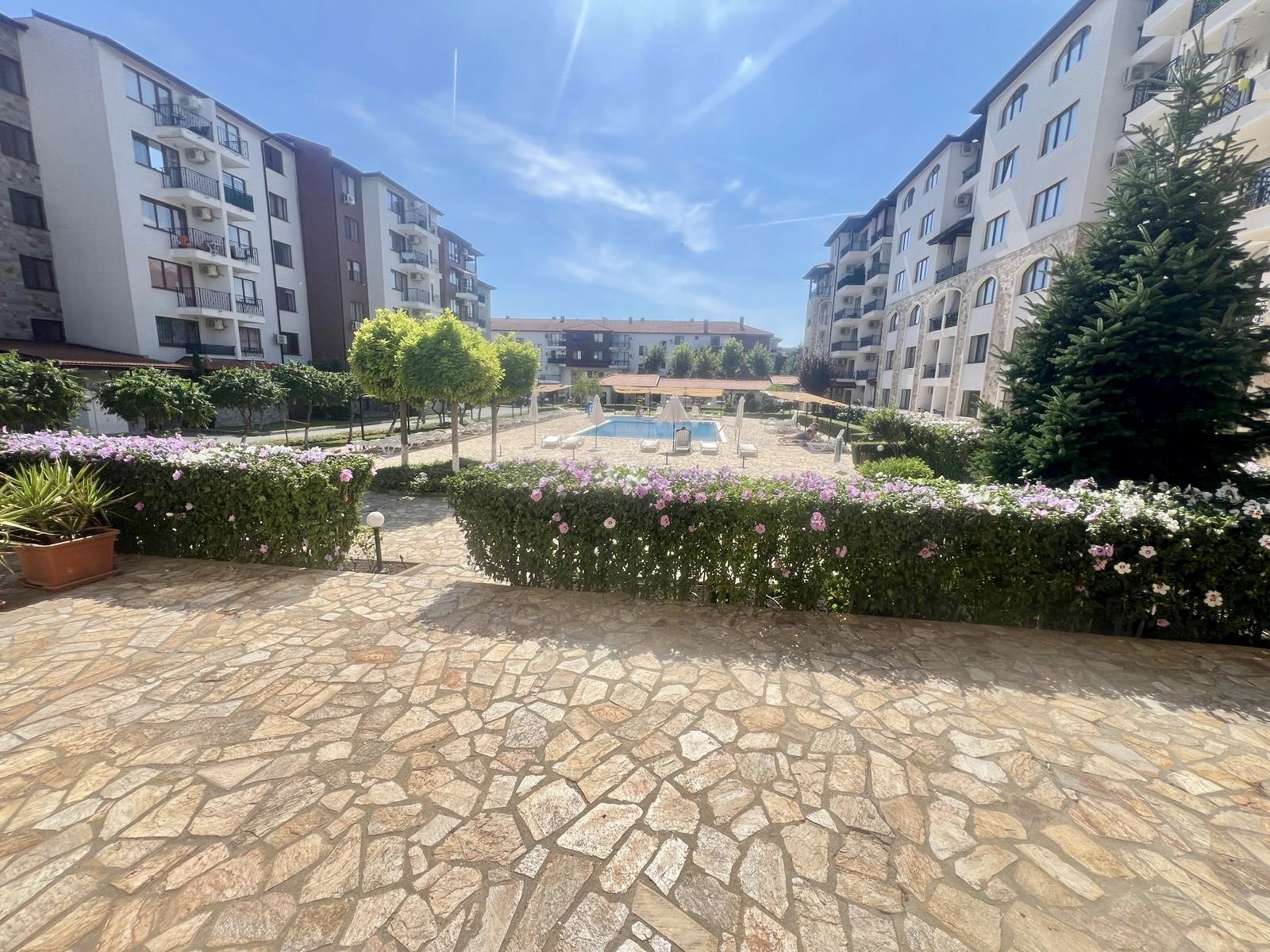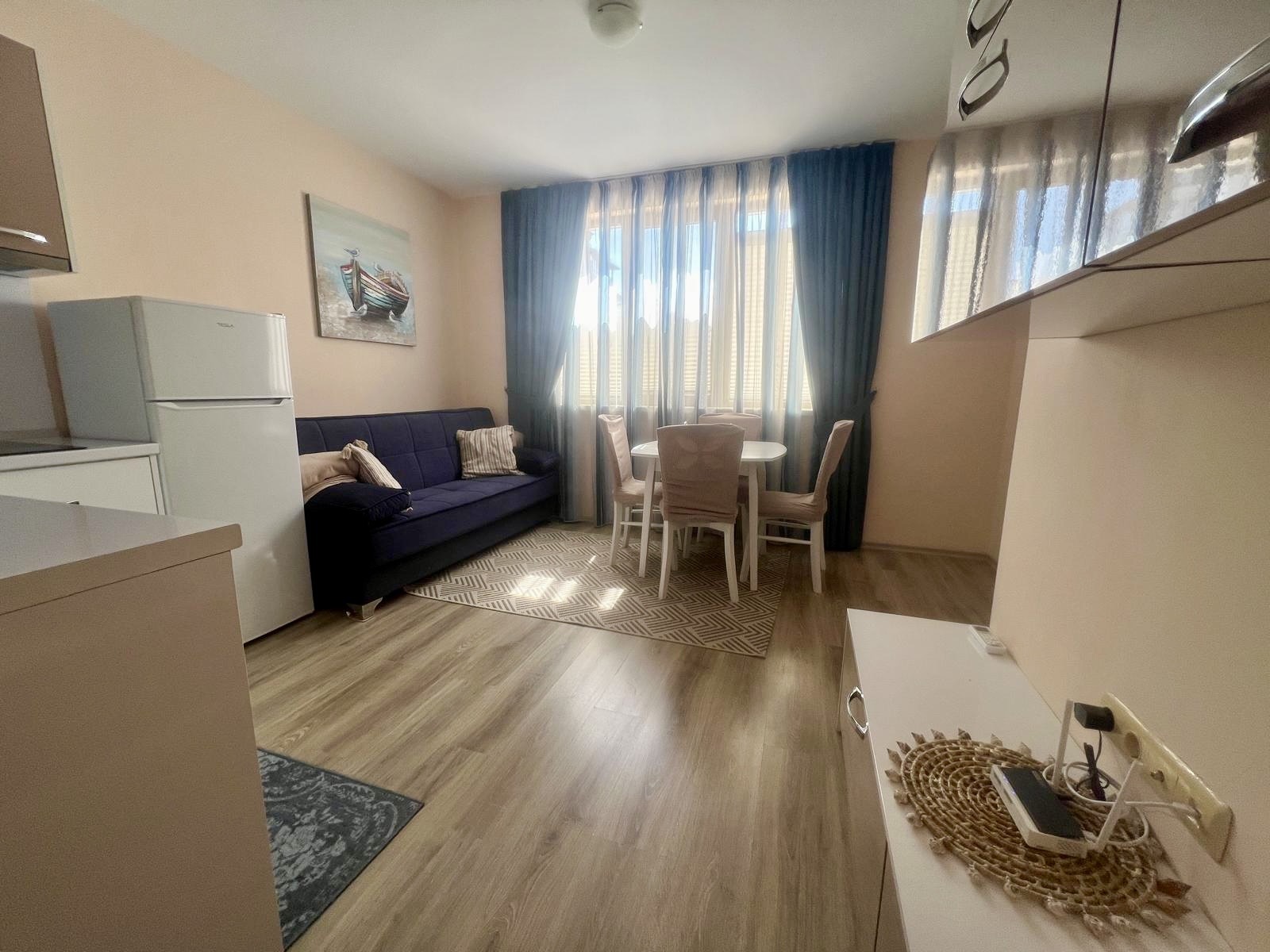 Предлагаме за продажба обзаведен двустаен апартамент в комплекс Аполон , стилен апарт-комплекс, разположен в тих и спокоен район, само на 250 м. от плажа Аурелия, едно от най - живописните места по българското Черноморие, така наречения Залив на потъналият кораб. Апартаментът е с квадратура 49 кв.м. и се намира на първи партерен етаж в сграда с асансьор. Състои се от дневна с зона за отдих, коридор, спалня, баня с душ кабина и тоалетна, веранда с двор и гледка към басейна. Апартаментът се продава напълно обзаведен и оборудван, готов за нанасяне. Комплексът е с отлично поддържана просторна озеленена територия, предлага открит плувен басейн с детска секция, джакузи, детска площадка, собствен паркинг, ресторант, дневен бар и супермаркет, с възможност за ползване на тенис корт , спортно игрище и спа център. Комплексът е с целогодишно управление - денонощна охрана, видеонаблюдение, почистване, техническа поддръжка. ограничен достъп. С Акт 16 и Разрешение за ползване. Осигурен е трансфер от и до летище Бургас, предлагат се разнообразни екскурзии и развлечения за почиващите. Прекрасно място за почивка и семеен отдих, съчетаващо близостта до морето и тази до Стария Несебър. Районът е с добра инфраструктура, комуникации и удобен автобусен транспорт.