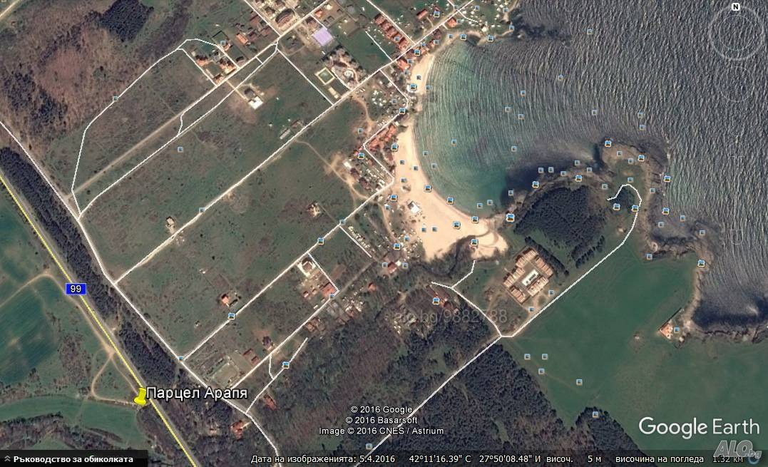 Поземлен имот от 9700 кв.м. намиращ се на 900 м. от плажа на Арапя, до главен път Бургас-Царево, на 400 м. от хотелски комплекс Vila Skay и ресторант Арапя . Парцелът е 9700 кв.м. В близост до хубава плажна ивица с три залива- голям плаж, малък плаж и миден залив, разнообразни заведения за хранене и развлечение, магазин. Има директна връзка с пътя към плажа с проход под главният път Бургас - Царево.