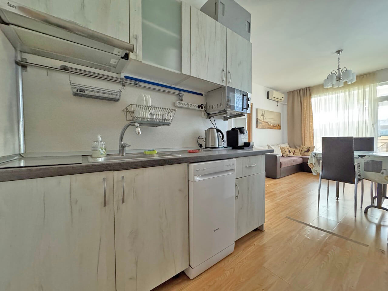 Предлагаме за продажба просторен обзаведен тристаен апартамент в комплекс Sunny Dаy 6 , разположен в тих и спокоен район, на 3 км от центъра на курорта Слънчев бряг. Апартаментът е с площ от 77 кв.м. и се намира на първи партерен етаж от четириетажна жилищна сграда без асансьор. Разпределение: антре, дневна с кухненски бокс и кът за хранене, зона за отдих, 2 спални, баня с душ кабина и тоалетна, 2 тераси с гледка към красиво озеленената територия на комплекса. Комплексът предлага открити плувни басейни, бар, детска площадка, ресторант, магазин, добре поддържани зелени градини, тенис корт, охраняеми паркоместа. Комплексът е с целогодишно управление, денонощна охрана, видеонаблюдение, почистване, техническа поддръжка, ограничен достъп. Акт 16. Таксата поддръжка е 8 евро на кв.м. на година Апартаментът е изключително подходящ за живеене и отдаване под наем целогодишно.