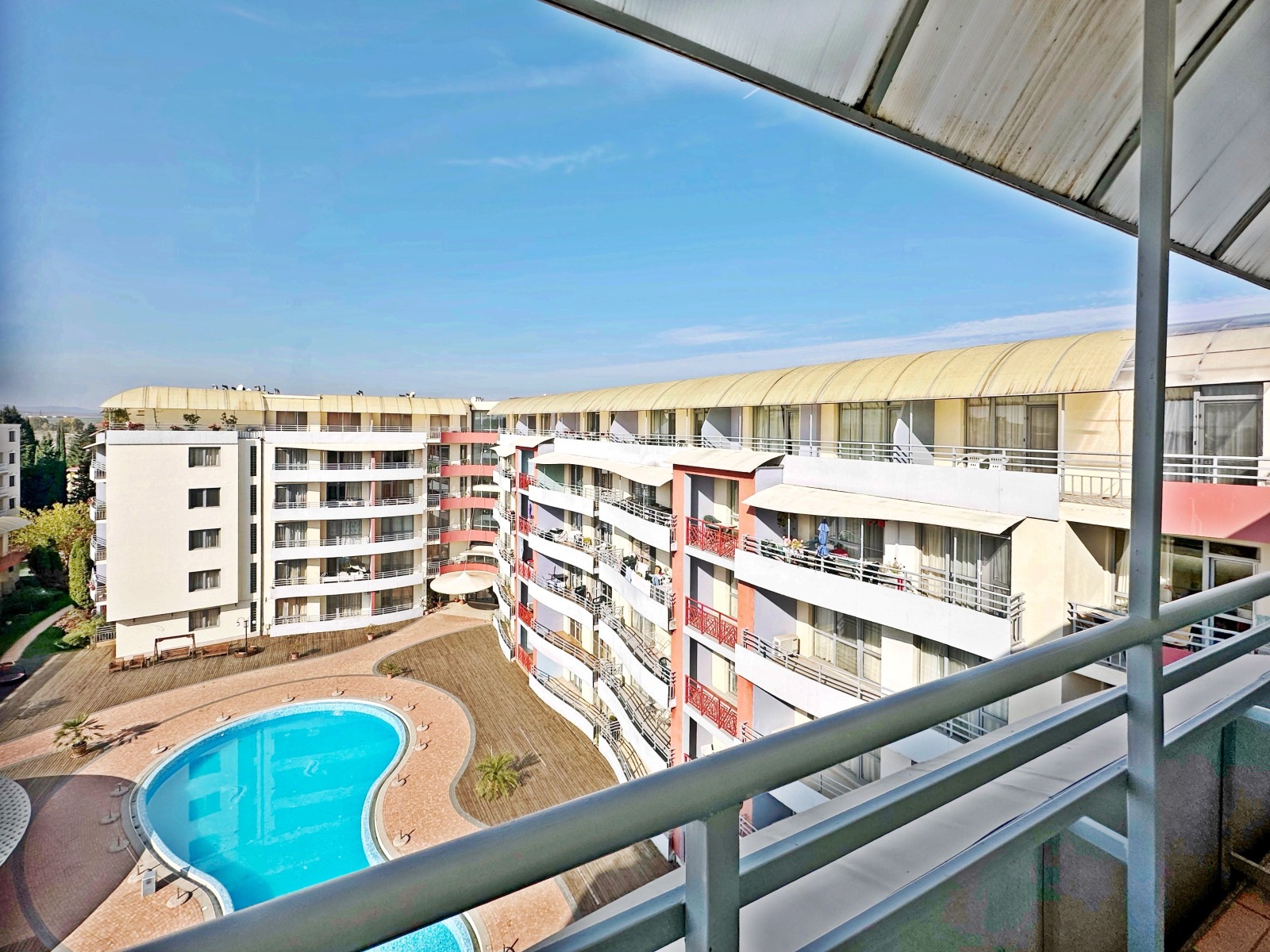 Апартаментът се намира на шести етаж и е с квадратура 66 кв.м., в сграда за целогодишно живеене. Разпределение - антре, просторна дневна с кухненски бокс, баня с душ кабина и тоалетна, голяма тераса с изглед към басейна юго-западно изложение. Апартамента се продава напълно обзаведен с оборудван кухненски бокс.