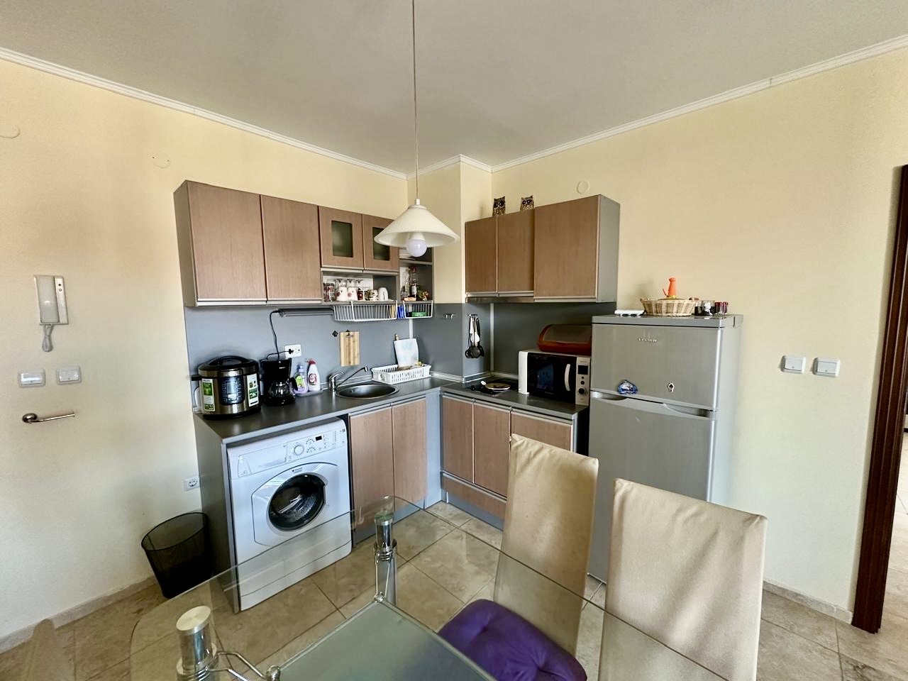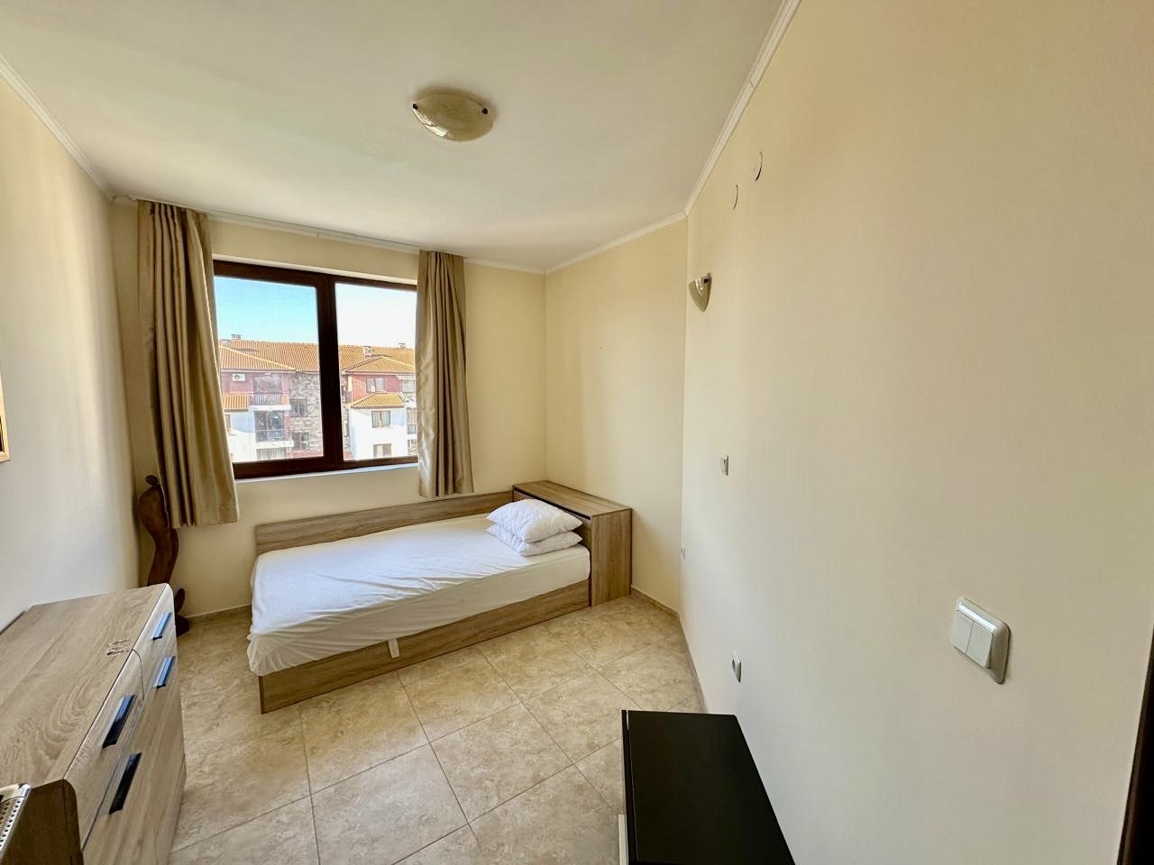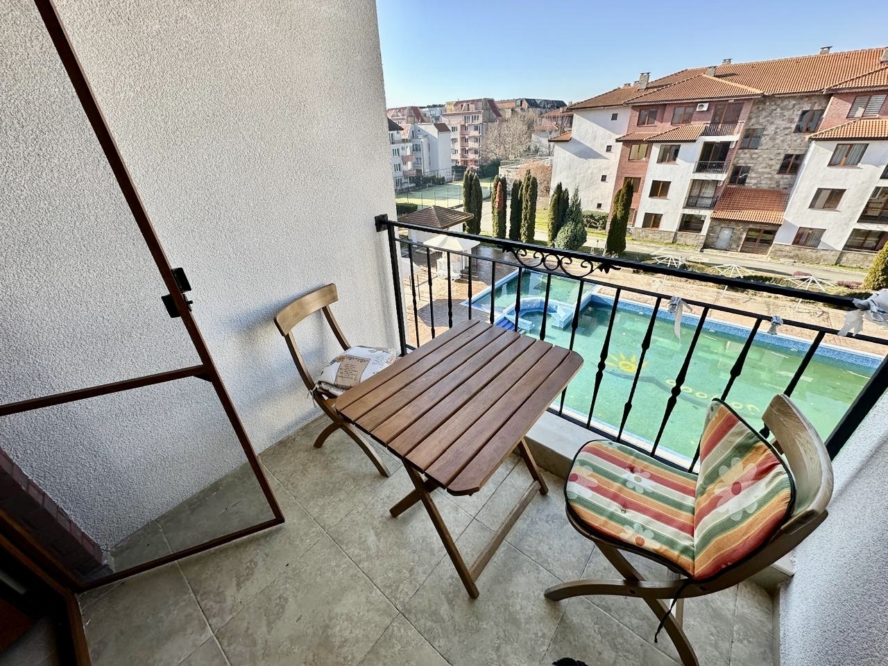 Предлагаме за продажба обзаведен тристаен апартамент в комплекс Аполон , стилен апарт-комплекс, разположен в тих и спокоен район, само на 250 м. от плажа Аурелия, едно от най - живописните места по българското Черноморие, така наречения Залив на потъналият кораб. Апартаментът е с квадратура 88 кв.м. и се намира на четвърти жилищен етаж в сграда с асансьор. Състои се от просторна дневна с кухненски бокс и кът за хранене, зона за отдих, коридор, 2 спални, баня с душ и тоалетна, тераса с гледка към басейна. Апартаментът се продава напълно обзаведен и оборудван, готов за нанасяне. Комплексът е с отлично поддържана просторна озеленена територия, предлага открит плувен басейн с детска секция, джакузи, детска площадка, собствен паркинг, ресторант, дневен бар и супермаркет, с възможност за ползване на тенис корт , спортно игрище и спа център. Комплексът е с целогодишно управление - денонощна охрана, видеонаблюдение, почистване, техническа поддръжка. ограничен достъп. С Акт 16 и Разрешение за ползване. Осигурен е трансфер от и до летище Бургас, предлагат се разнообразни екскурзии и развлечения за почиващите. Прекрасно място за почивка и семеен отдих, съчетаващо близостта до морето и тази до Стария Несебър. Районът е с добра инфраструктура, комуникации и удобен автобусен транспорт.
