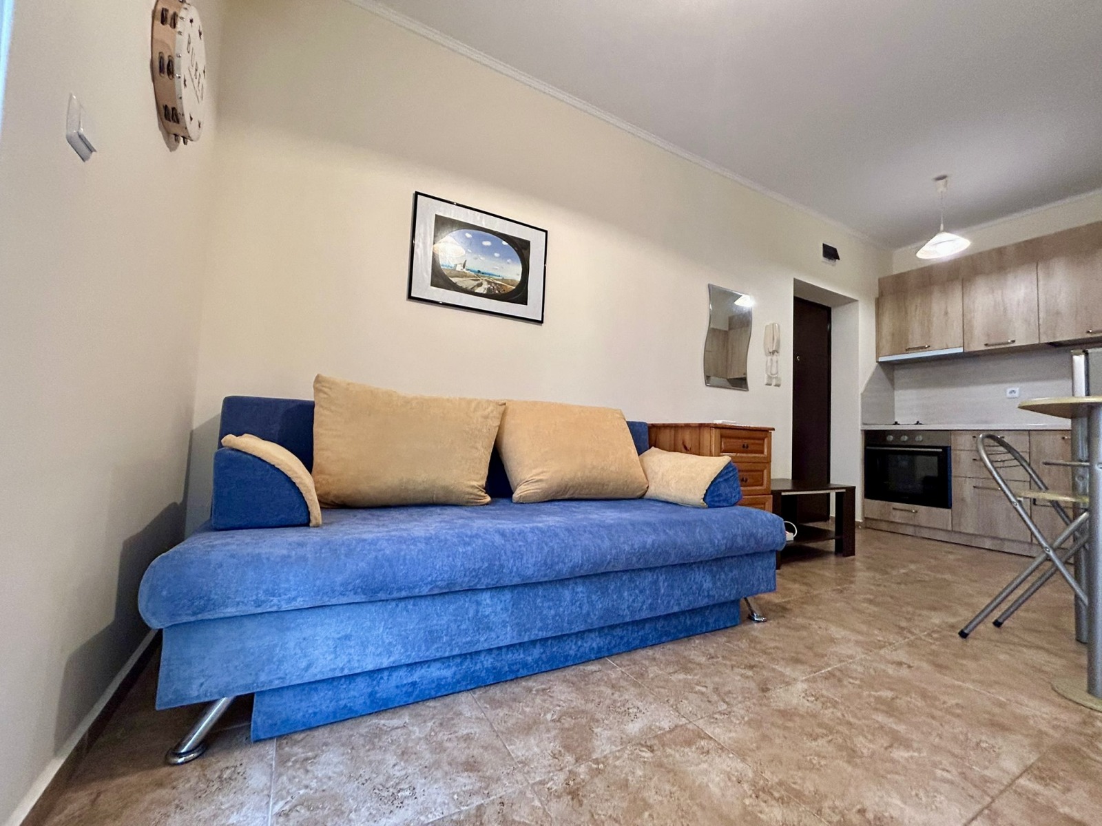 Предлагаме за продажба стилно обзаведен едностаен апартамент в комплекс Аполон , стилен апарт-комплекс, разположен в тих и спокоен район, само на 250 м. от плажа Аурелия, едно от най - живописните места по българското Черноморие, така наречения Залив на потъналият кораб. Апартаментът е с квадратура 40 кв.м. и се намира на втори жилищен етаж в сграда с асансьор. Състои се от дневна с кухненски бокс и кът за хранене, зона за отдих и спален кът, баня с душ кабина и тоалетна, тераса с гледка към територията на комплекса. Апартаментът се продава напълно обзаведен и оборудван, готов за нанасяне. Комплексът е с отлично поддържана просторна озеленена територия, предлага открит плувен басейн с детска секция, джакузи, детска площадка, собствен паркинг, ресторант, дневен бар и супермаркет, с възможност за ползване на тенис корт , спортно игрище и спа център. Комплексът е с целогодишно управление - денонощна охрана, видеонаблюдение, почистване, техническа поддръжка. ограничен достъп. С Акт 16 и Разрешение за ползване. Осигурен е трансфер от и до летище Бургас, предлагат се разнообразни екскурзии и развлечения за почиващите. Прекрасно място за почивка и семеен отдих, съчетаващо близостта до морето и тази до Стария Несебър. Районът е с добра инфраструктура, комуникации и удобен автобусен транспорт.