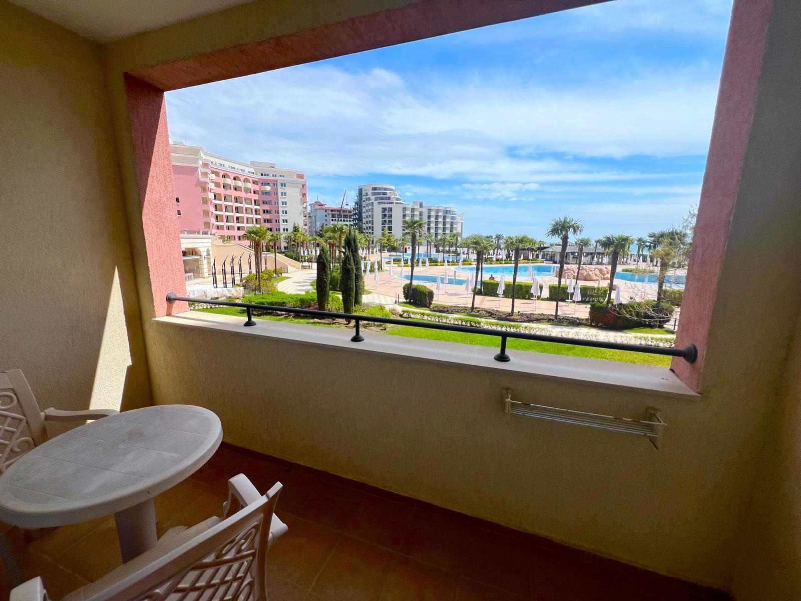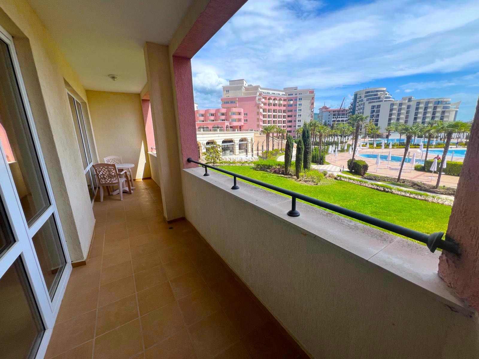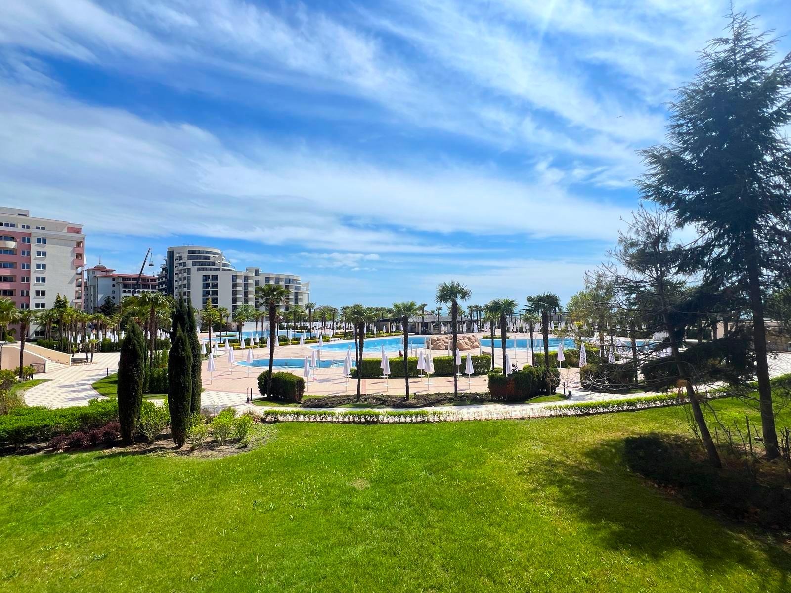 Предлагаме двустаен апартамент в луксозния комплекс Маджестик намиращ се на първа линия на морския бряг. Апартаментът е с обща площ от 89 кв.м. и е разположен е на втори жилищен етаж. Състои се от просторна дневна с кухненски бокс, спалня, коридор, баня с вана и тоалетна, и просторен балкон с гледка към морето и басейна. Отоплението се осъществява посредством централна климатична система.