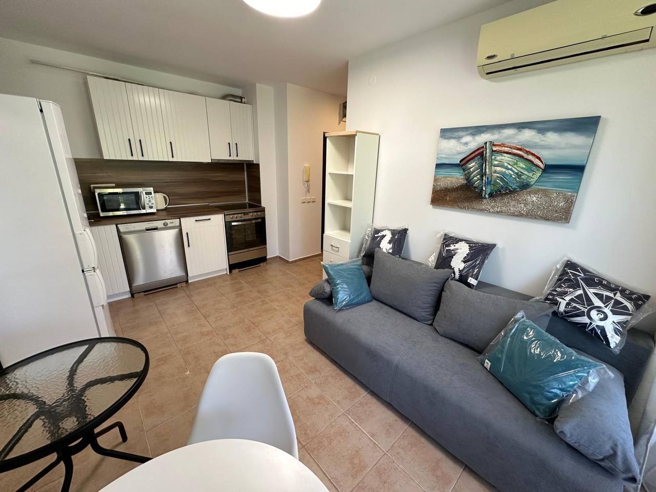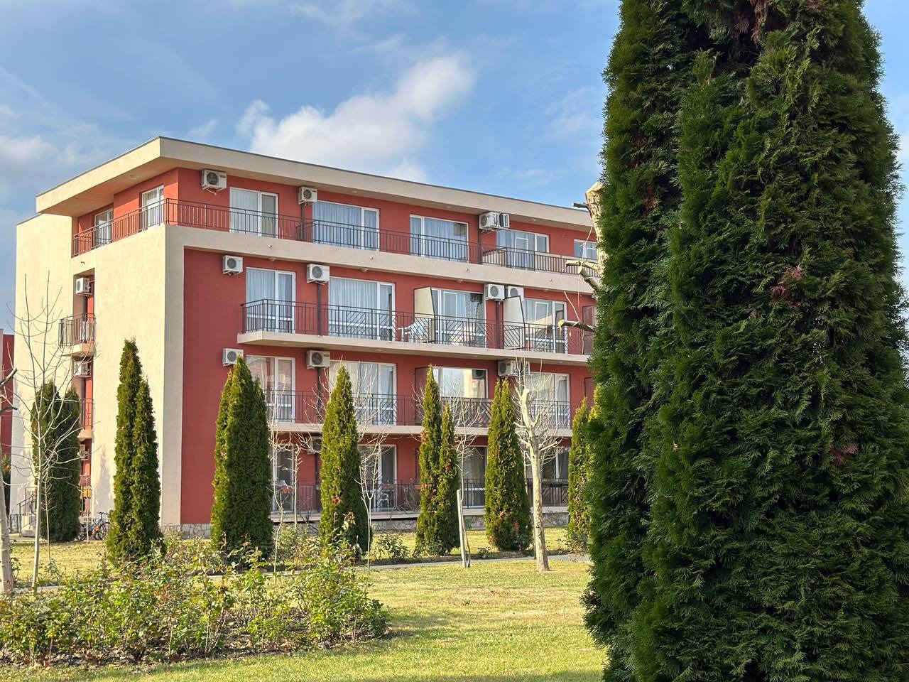 Предлагаме за продажба двустаен апартамент в комплекс Холидей Форт Голф Клуб . Комплексът е в непосредствена близост до Action Аквапарк и големия супермаркет ММ. Апартаментът се намира на първи партерен етаж в четири етажна сграда без асансьор и е с квадратура 50 кв.м. Разпределение: дневна с кухненски бокс и кът за хранене, зона за отдих, спалня, баня с душ кабина и тоалетна, тераса с гледка към озеленените площи на комплекса. Апартаментът се продава обзаведен и оборудван. Комплексът предлага комфорт, уют и удобство басейн с детска секция и водни пързалки, детски площадки, два ресторанта, Фитнес и сауна, магазин, бюро за обмяна на валута, изключително добре поддържана и красиво озеленена градина, целогодишна охрана и поддръжка. Комплексът е с много локация, в близост до автобусна спирка, разнообразни магазини и заведения за хранене и развлечения. Акт 16 и Разрешение за ползване. Апартаментът е изключително подходящ за живеене и отдаване под наем целогодишно.