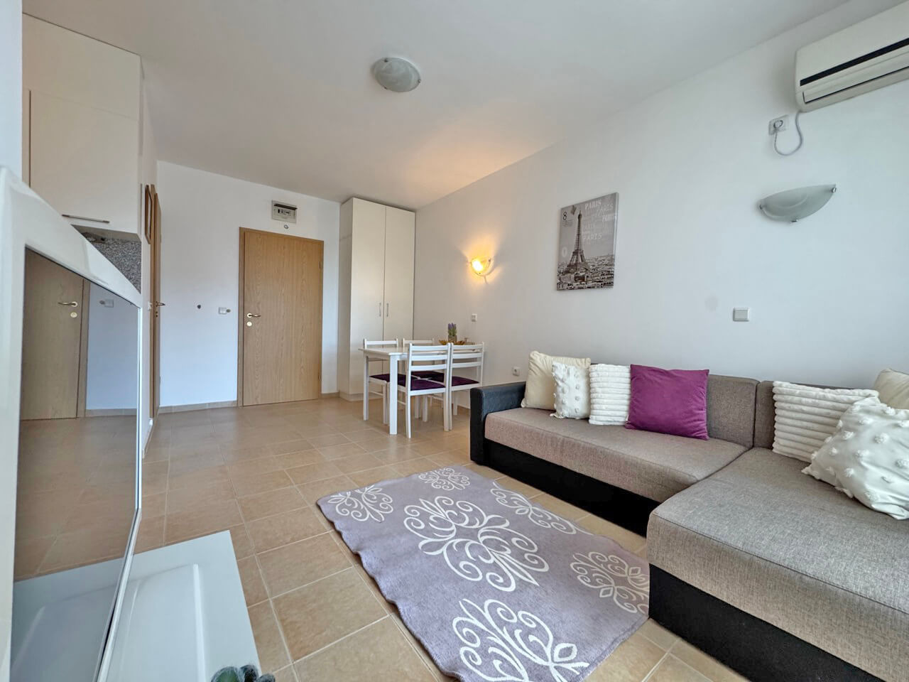 Предлагаме за продажба уютен обзаведен двустаен апартамент с ниска такса поддръжка в северната част на к.к. Слънчев бряг, в к-с Dimond Bay . Апартаментът е с квадратура от 50 кв.м, и е разположен на първи жилищен етаж в сграда с асансьор. Разпределение : дневна с кухненски бокс и кът за хранене, зона за отдих, спалня, баня с душ и тоалетна, тераса с гледка към басейна. Продава се напълно обзаведен и оборудван. Комплексът се намира на около 500 метра от плажа и крайбрежната алея. Разполага с басейн, ресторант, паркинг, добре поддържани озеленени площи, целогодишна охрана и поддръжка. Комплексът е разположен в тих и спокоен район, но в близост до разнообразни магазини, заведения за хранене и развлечения, в близост до автобусна спирка. Акт 16 и отделни партиди за ток. Таксата поддръжка е 8 евро на кв.м. на година. Апартаментът е изключително подходящ за целогодишно живеене и отдаване под наем целогодишно.