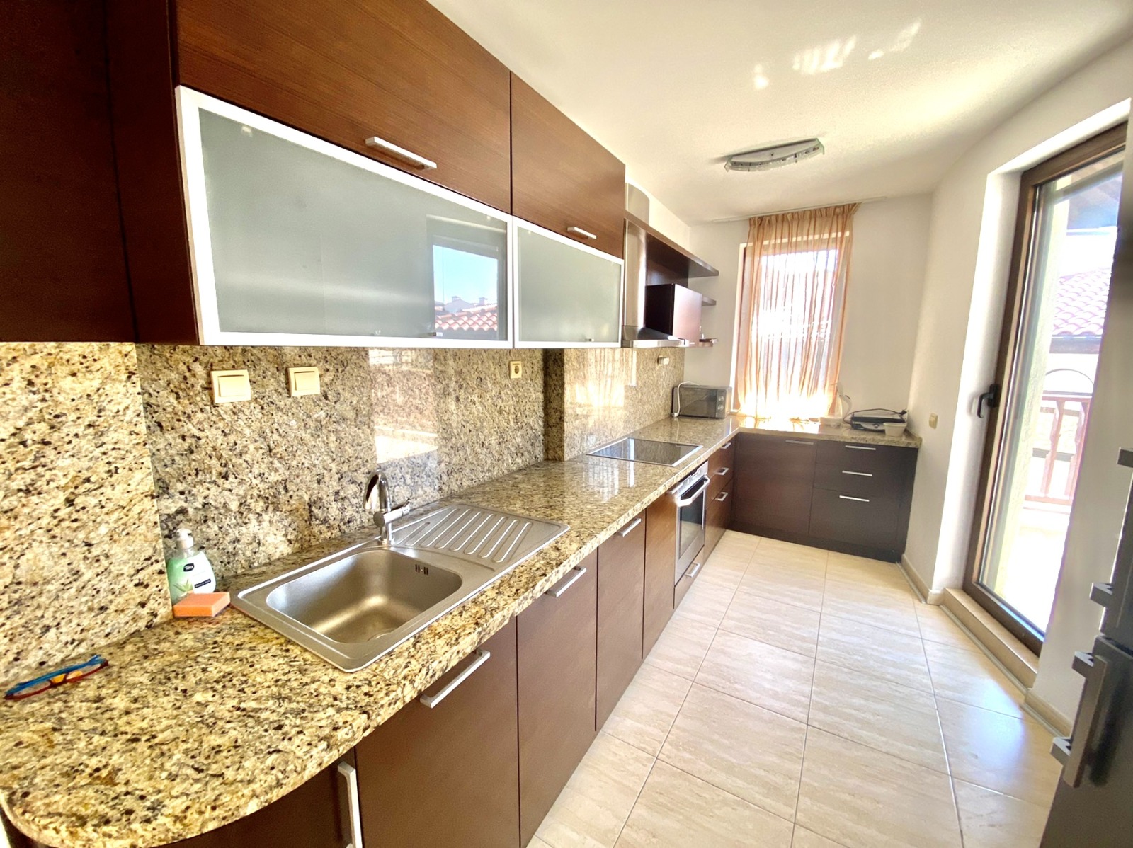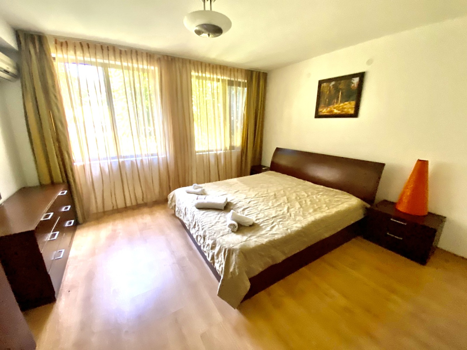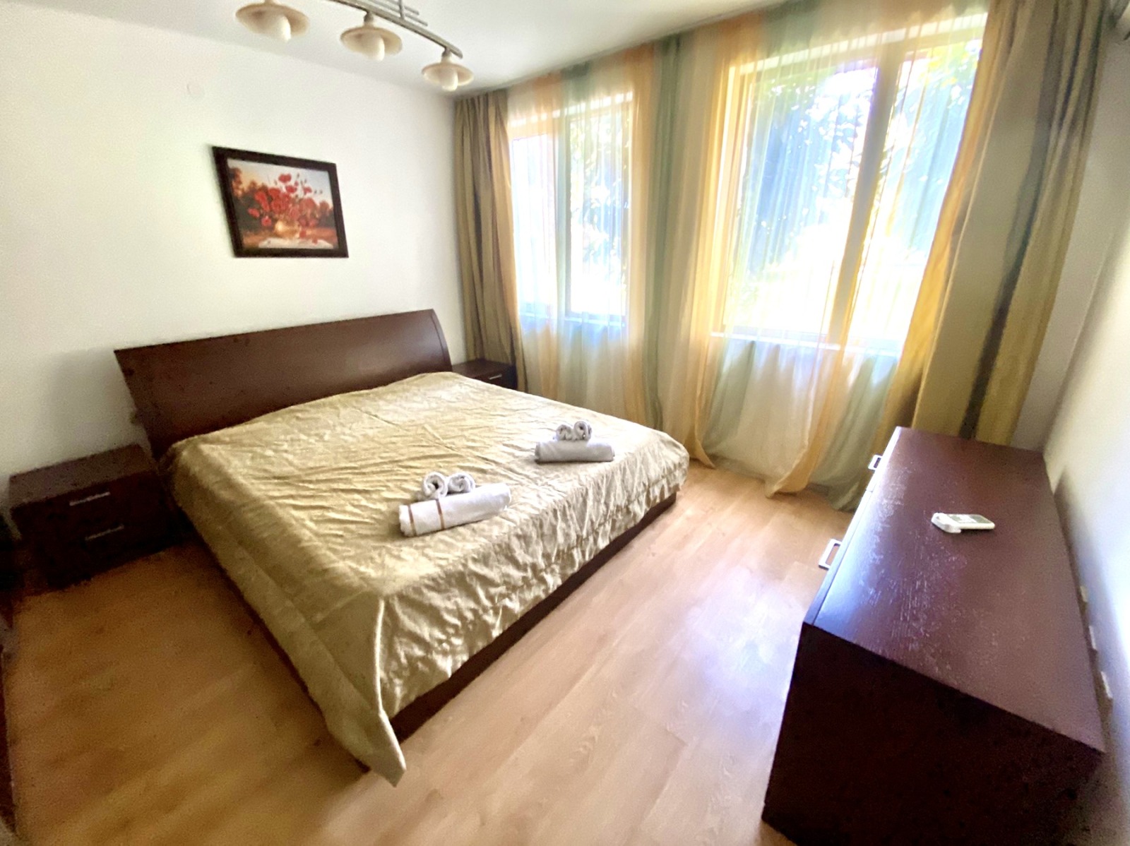 Апартаментът е изключително подходящ за живеене и отдаване под наем целогодишно. Акт 16 и битов ток. Годишната такса поддръжка е 700 евро.