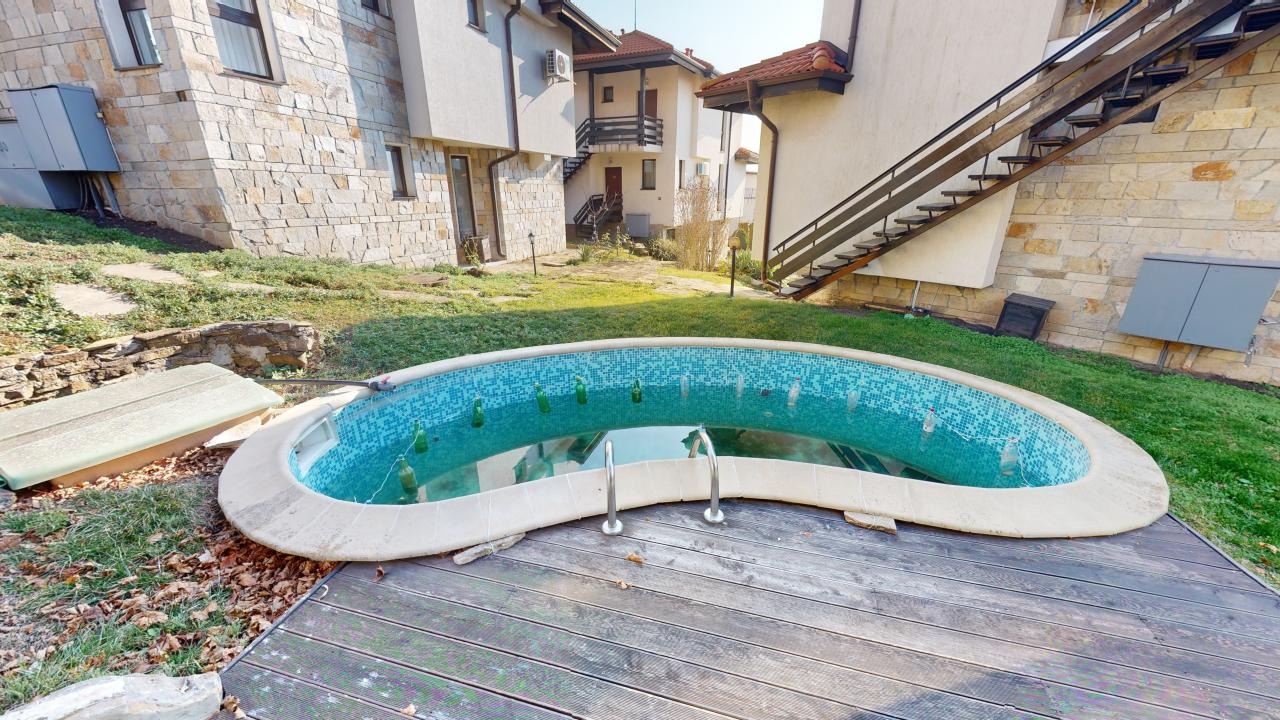 Предлагаме за продажба обзаведена двуетажна самостоятелна къща с три спални в комплекс Bay View Villas в Кошарица. Комплексът се намира в тих и спокоен район, в подножието на Стара Планина, съчетание на чист въздух и красива природа. Къщата е двуетажна и е с площ 143 кв.м. Разпределение: първи етаж - просторна дневна с кухненски бокс и кът за хранене, зона за отдих, складово помещение, баня с тоалетна, просторна веранда до басейна; втори етаж: 3 спални- едната от които със самостоятелна баня с вана и тоалетна, коридор, отделна баня с вана и тоалетна, тераса с гледка към басейна. Продава се напълно обзаведена и оборудвана. Комплекс Bay View Villas е комплекс от затворен тип, намира се на три километра от крайбрежието на черноморския курорт Слънчев бряг, който е само на 5 минути път с кола или автобус. Комплексът е в близост до автобусна спирка и целогодишно работещ супермаркет. Удобствата, които комплекса предлага са: SPA център,фитнес център, фризьорски салон, солариум, басейн с морска вода с джакузи, хидромасажна вана и два масажни кабинета, 2 големи басейна, рецепция, 2 ресторанта, мини голф, билярд, детска площадка, мини супермаркет,трансфер до Слънчев бряг и Несебър, денонощна охрана през цялата година. Акт 16 и битов ток. Апартаментът е изключително подходящ за живеене и отдаване под наем целогодишно.