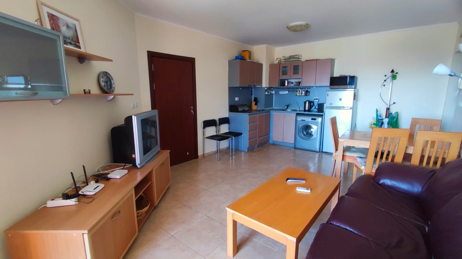 Предлагаме за продажба просторен обзаведен двустаен апартамент с частична гледка към морето в комплекс Аполон 5 - стилен апарт-комплекс, разположен в тих и спокоен район, само на 250 м. от плажа Аурелия , едно от най живописните места по българското Черноморие, така наречения Залив на потъналият кораб. Апартаментът е с квадратура 60 кв.м. и се намира на пети последен жилищен етаж в сграда с асансьор. Разпределение: просторна дневна с напълно оборудван кухненски бокс, зона за хранене и зона за отдих, спалня, баня с душ кабина и тоалетна , тераса с частична гледка към морето. Апартаментът се продава напълно обзаведен и оборудван, готов за нанасяне. Комплексът е с отлично поддържана просторна озеленена територия, предлага открит плувен басейн с детска секция, джакузи, детска площадка, собствен паркинг, ресторант, дневен бар и супермаркет, с възможност за ползване на тенис корт , спортно игрище и спа център. Комплексът е с целогодишно управление - денонощна охрана, видеонаблюдение, почистване, техническа поддръжка. ограничен достъп. С Акт 16 и Разрешение за ползване. Осигурен е трансфер от и до летище Бургас, предлагат се разнообразни екскурзии и развлечения за почиващите. Прекрасно място за почивка и семеен отдих, съчетаващо близостта до морето и тази до Стария Несебър, Районът е с добра инфраструктура, комуникации и удобен автобусен транспорт. Апартаментът е подходящ за целогодишно живеене и отдаване под наем.