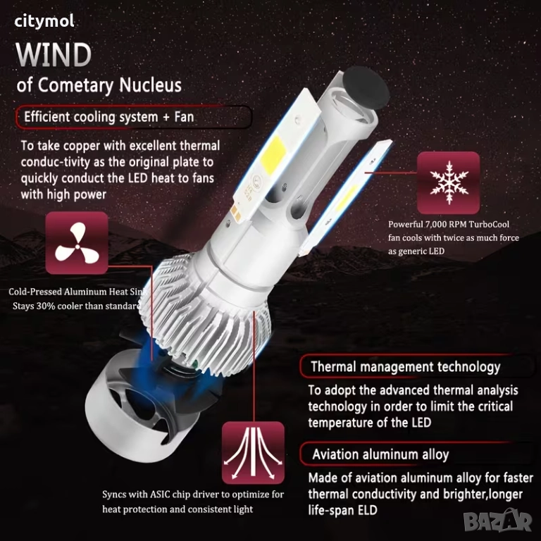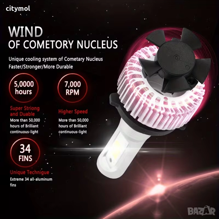 - Изцяло алуминиев корпус с функция за бързо охлаждане, осигуряваща безопасна температура и дълъг живот, до 50 000 часа;