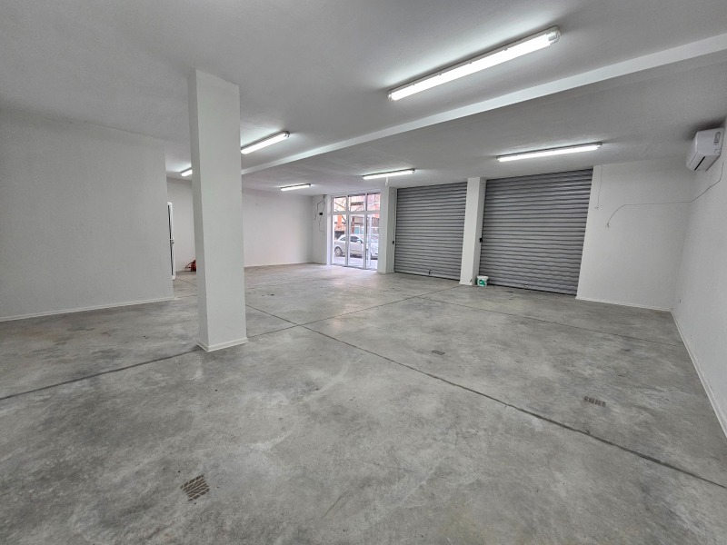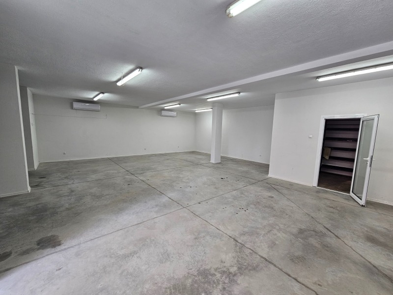 Помещението е с площ 130 кв.м и се състои от осносвно помещение, допълнително складово помещение и санитарен възел(баня с тоалетна).