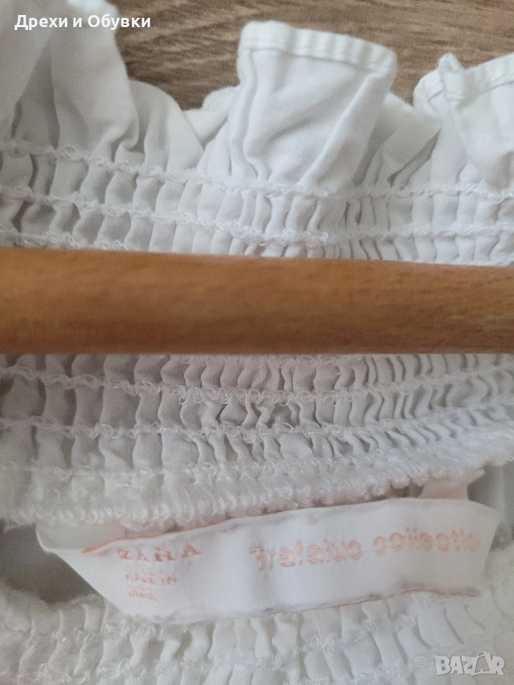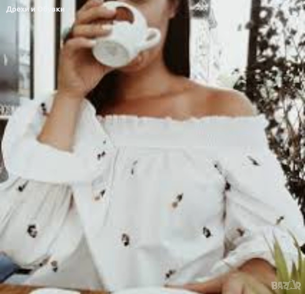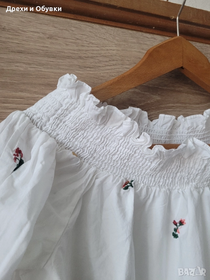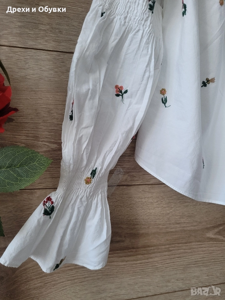 Много красива бяла блуза с бродирани цветя и ластик при раменете ZARA.