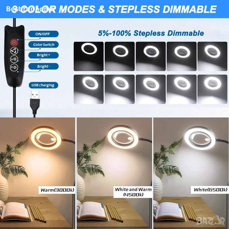 Подобрена здрава лупа - Настолната лампа с лупа има претеглена и уголемена основа. Основата е с претеглено тегло, което я прави здраво закрепена на мястото ѝ и не се накланя. Може лесно да се монтира без инструменти. Просто поставете рамото на лампата директно в основата, за да фиксирате лупата. Включени са противоплъзгащи подложки, за да направи лампата по-стабилна. (С USB кабел, без щепсел)