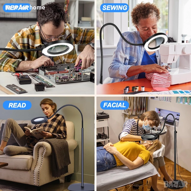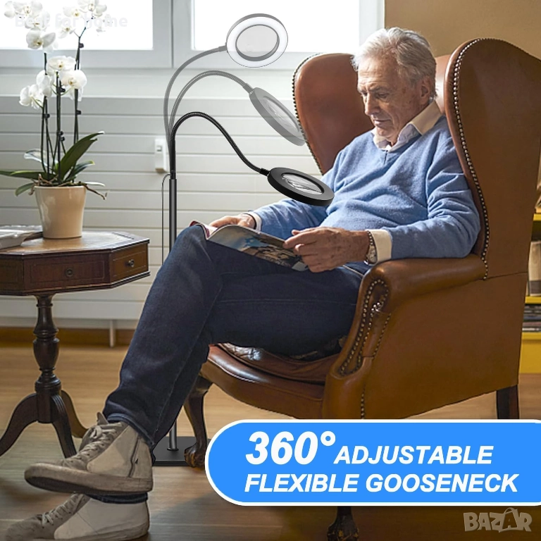 Регулируема височина и гъвкава гъша шия - Подовата лупа има двусекционен регулируем по височина опорен прът, който може свободно да се комбинира в две различни височини, което ви позволява да го персонализирате според вашите нужди, подходящ за офис бюра, трапезни маси, дивани и до легла. 360° регулируема гъша шия, предлагаща широк обхват на движение.