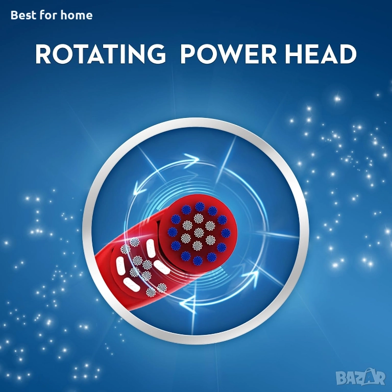 Въртящата се глава Power Head достига, обгръща и почиства старателно множество повърхности, докато повдигнатите влакна в централен ред помагат за почистването на дъвкателните повърхности. Работи с батерии (най-добре с батерии Polaroid AA)