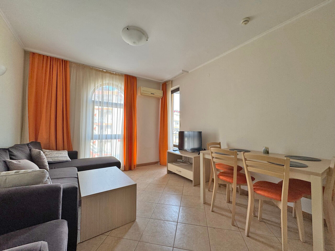 Предлагаме за продажба обзаведен двустаен апартамент в комплекс Royal Sun , прекрасен комплекс, с отлично поддържана огромна и просторна красиво озеленена територия, разположена върху 10 000 квадратни метра площ. Комплексът се намира в централната част на Слънчев Бряг. Апартаментът е с обща площ 55 кв.м., и се намира на пети жилищен етаж. Разпределение: просторна дневна с кухненски бокс с трапезарен кът, зона за отдих, спалня, коридор, баня с душ кабина и тоалетна, тераса. Апартаментът се продава напълно обзаведен и оборудван. Комплекс Royal Sun е целогодишен комплекс с отлична инфраструктура и разположение, предлага широка гама от услуги и развлечения: три басейна, включително и детски, СПА център, масаж, джакузи, сауна, солариум, фитнес, козметичен център, 24-часова целогодишна охрана и поддръжка и много други, което го прави изключително подходящ за живеене и отдаване под наем целогодишно. Акт 16 и битов ток.