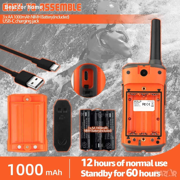 Дълъг живот на батерията и зареждане чрез USB тип C; презареждащи се уоки-токита; 3 презареждащи се NIMH батерии AA 1000mAh (включени); време на готовност до 60 часа; USB тип C порт за зареждане; икона на батерията се показва на екрана по време на зареждане; водоустойчивата двупосочна радиостанция RT45P е съвместима и с обикновени батерии (не са включени); можете да подготвите резервни батерии предварително.