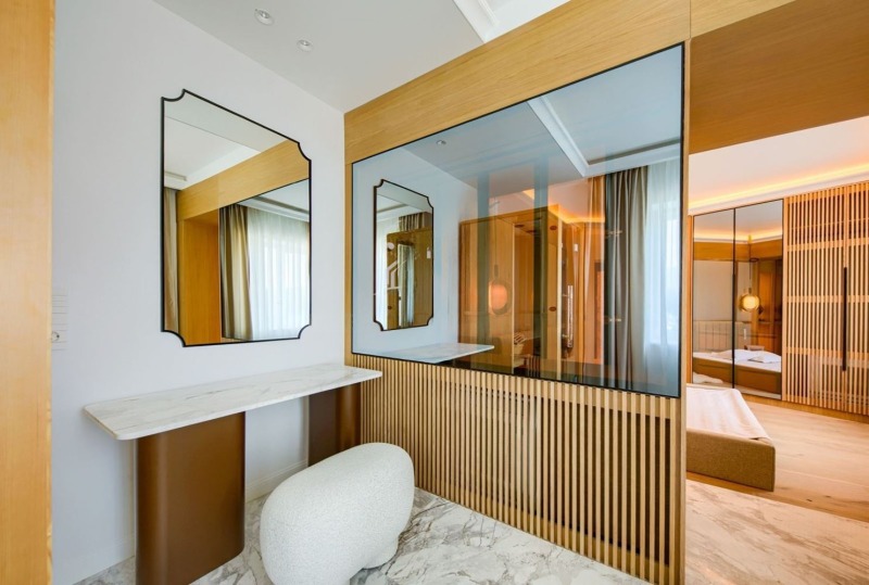 Овалният вход, изпълнен в мрамор и топли дървесни панели, задава архитектурен ритъм, който носи едновременно класа и спокойствие.