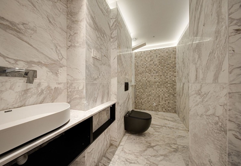 Луксозната кухня е завършена с мраморни плотове, светло дърво и графитени линии, подчертавайки модерния, спокоен лукс на пространството.