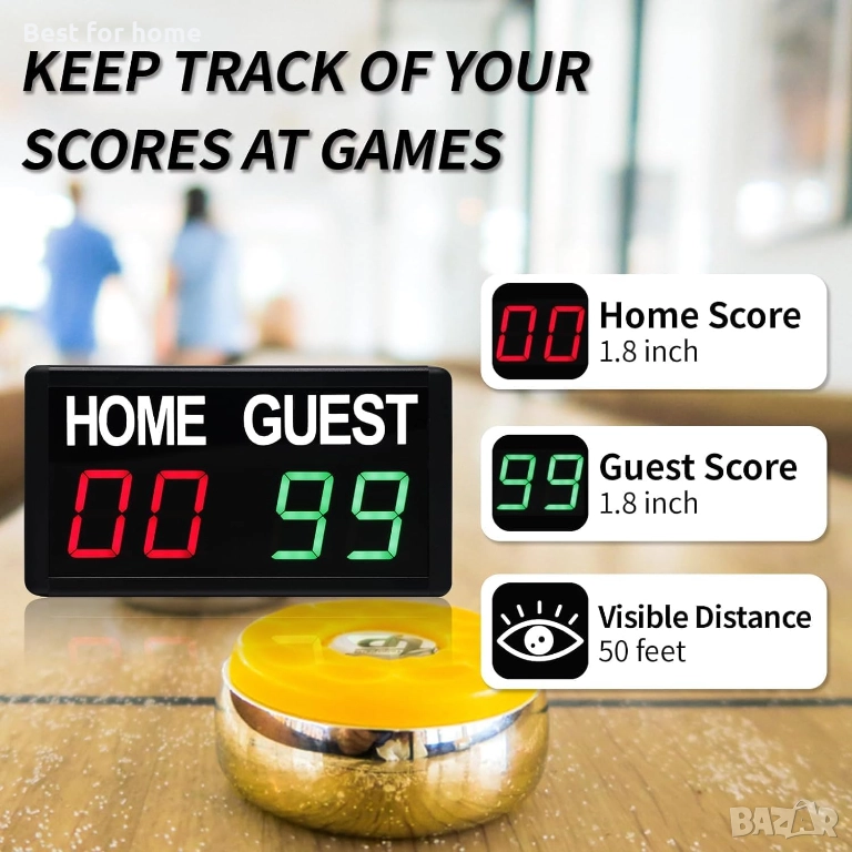 【LED дигитално табло】Размерът на електронното табло е 8,5x4,6x1,4 инча, с 1,8-инчов LED дигитален дисплей. Дигиталното табло може да показва резултати от 1 до 99 със знаци „HOME“ и „GUEST“, така че можете ясно да виждате промените в резултатите.