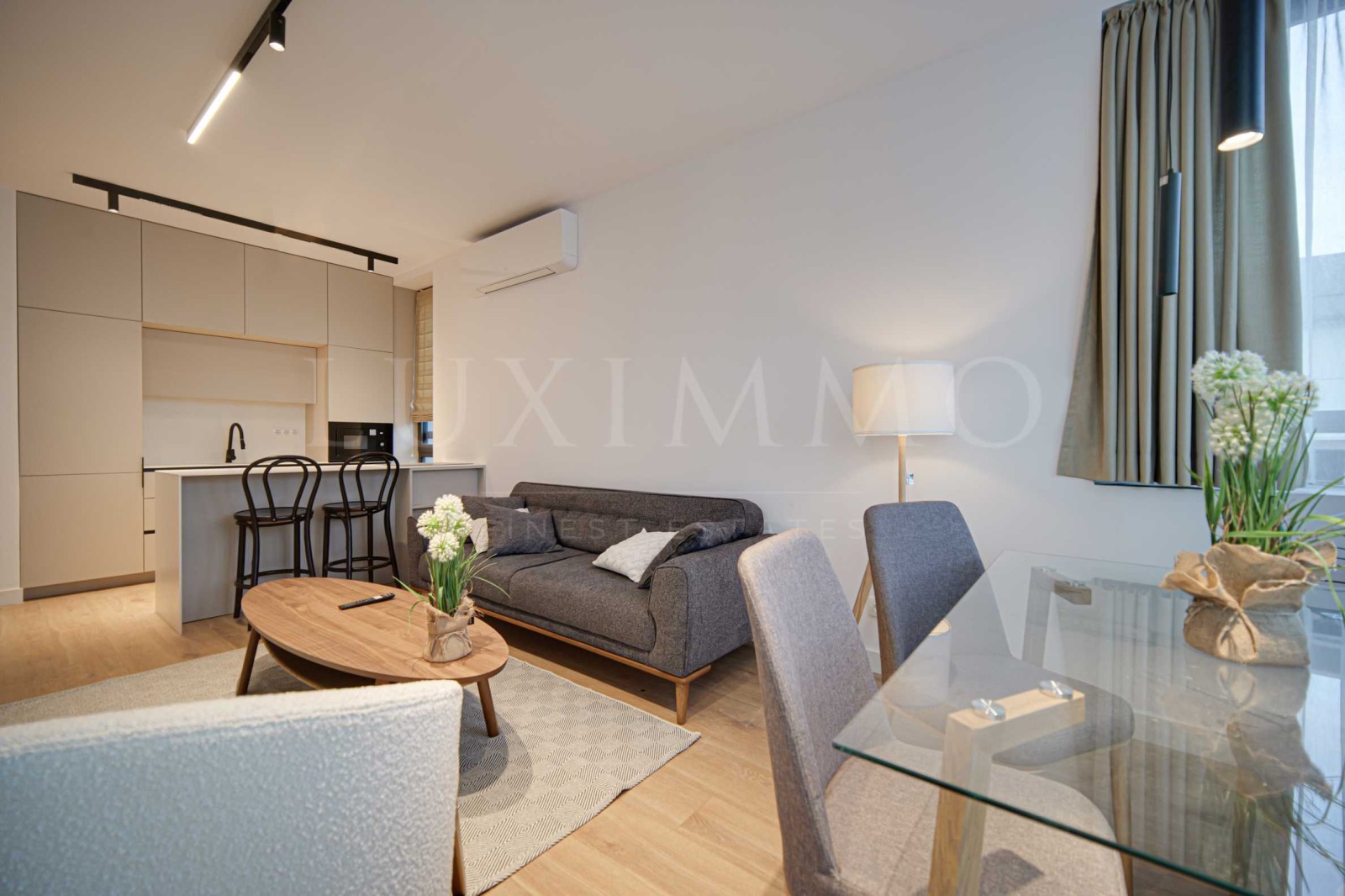 Обзавеждане: Чисто ново, в светли цветове бяло, бежово и сиво, с елегантни черни акценти, които придават стил и модерност на интериора;