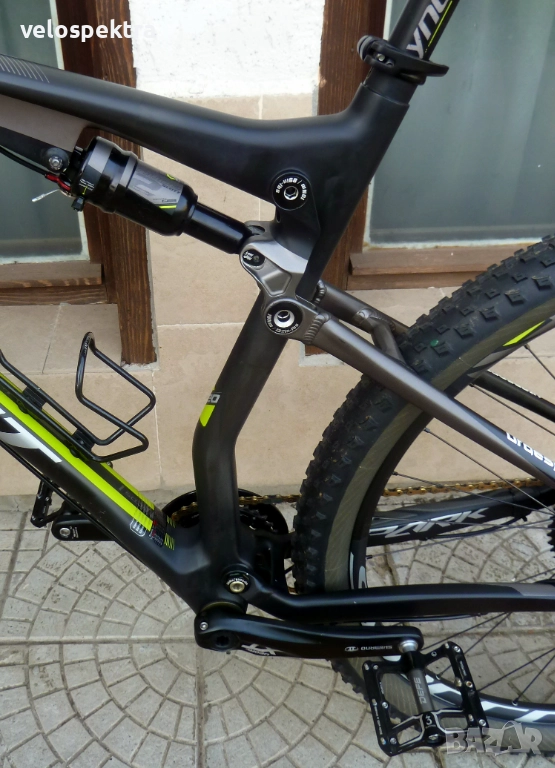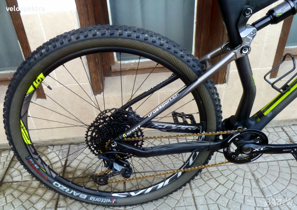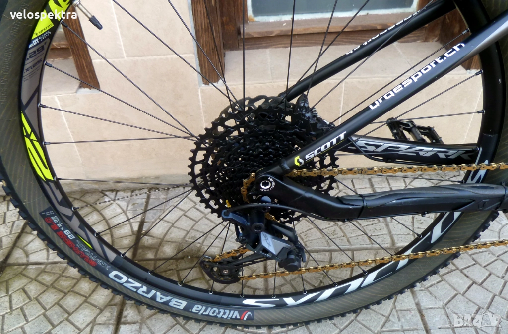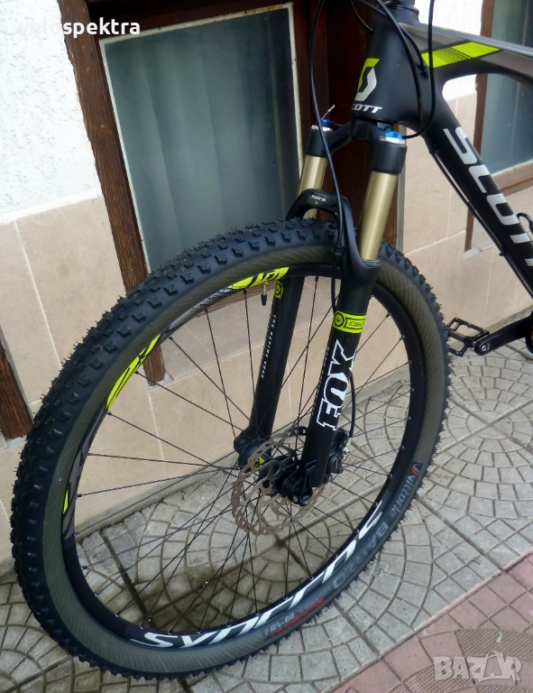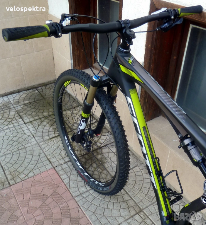 29 цола тристенни алуминиеви аеро капли ДТ СУИС с шини Syncros с проходни оси , главини със супер лек ход ДТ СУИС , предна ос 15 мм. задна ос 10 мм. , кевларени гуми МТВ 29" 2.4.