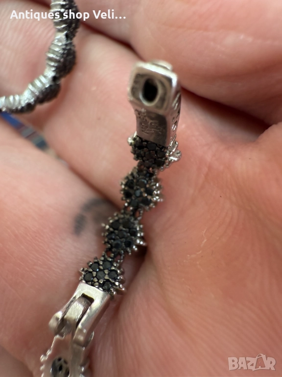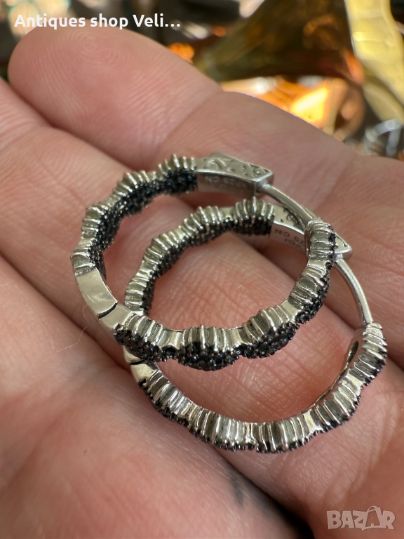 Красиви сребърни обеци със родиево покритие, инкрустирани с множество черни камъни. Предлагаме доставка с Еконт и лично предаване за градовете Велико Търново, Русе и Сливен!
