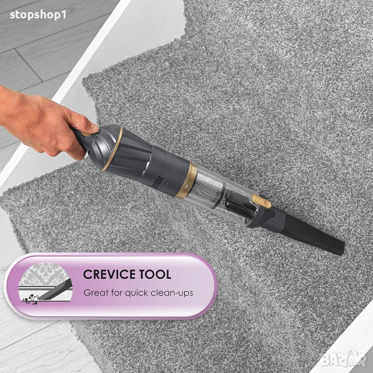 С размери 40 x 7 x 7 см и лек и компактен дизайн, прахосмукачката включва удобно място за съхранение и зареждане на плота.