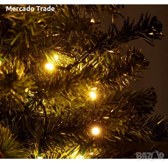 Декоративна коледна настолна елха с пластмасова основа и 50 топло бели LED лампички.