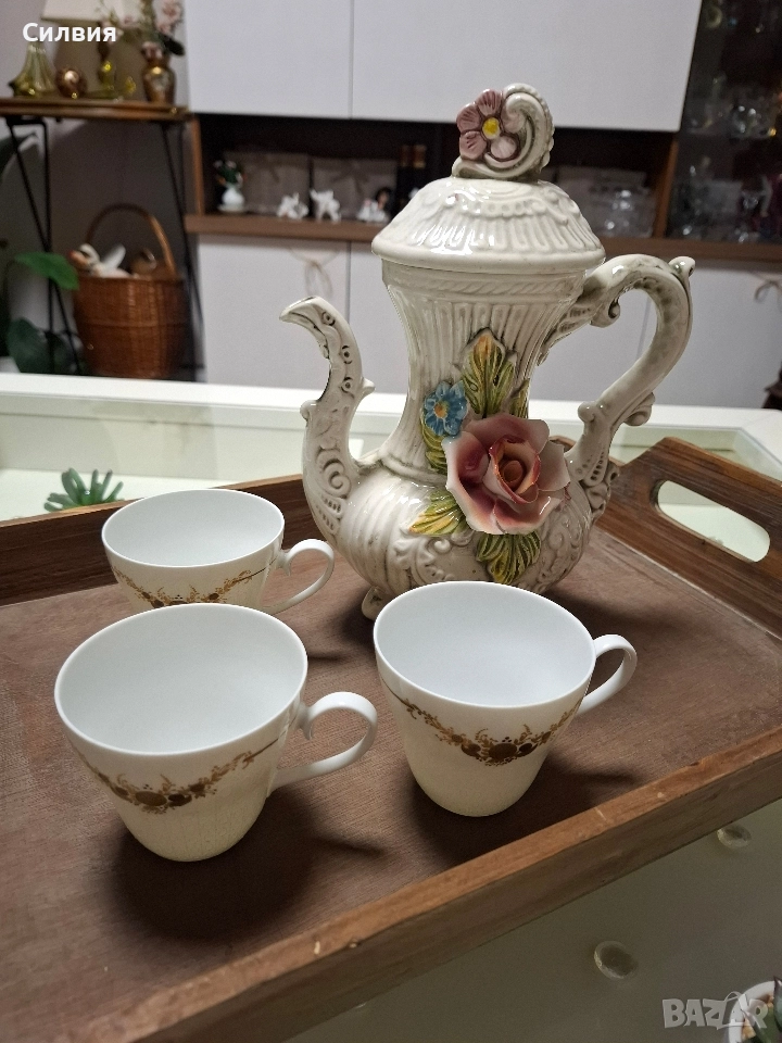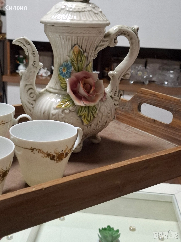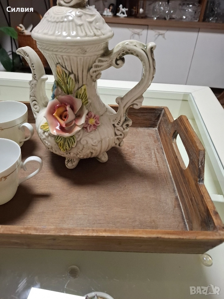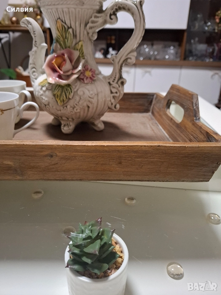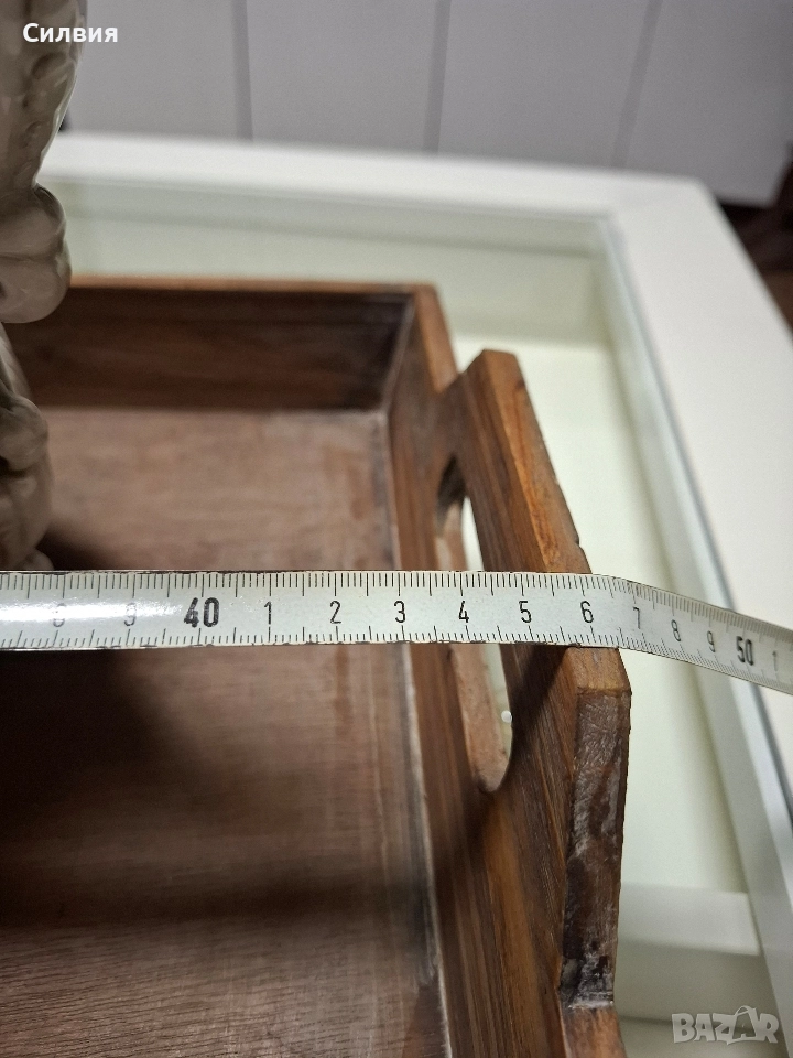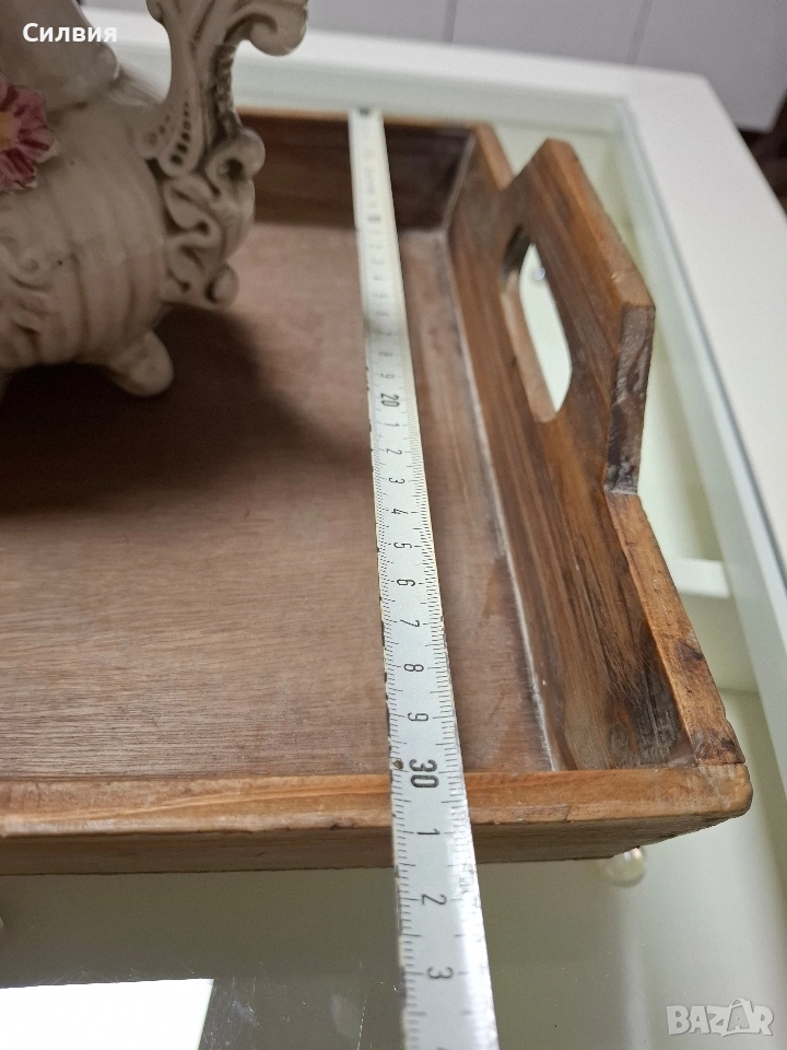 Този рустикален дървен поднос е чудесен акцент за всеки дом, предлагайки както функционалност, така и топло естетическо излъчване. Характеристики: Материал и Цвят: Изработен е от масивно дърво с видима, леко износена текстура, което му придава винтидж или селски (рустик) чар. Цветът е естествен тъмнокафяв или цвят на орех, с лека патина, която подчертава зърното на дървото. Дизайн: Подносът е с правоъгълна форма и има повдигнати странични ръбове, които предотвратяват изплъзването на поставените върху него предмети. Дръжки: В двата къси края са вградени отвори за дръжки, които позволяват лесно и сигурно пренасяне. Размери: 46 см (дължина) / 31 см (ширина) / 5 см (височина). Тези размери го правят достатъчно голям за сервиране на кафе/чай (както е показано на втората снимка), закуски или за декорация. Приложение: Сервиране: Идеален за сервиране на напитки, кафе или чай (като комплекта от порцеланов чайник и чаши), закуски или коктейли. Декорация: Може да бъде използван като декоративна основа за подреждане на свещи, вазички, книги или други аксесоари върху