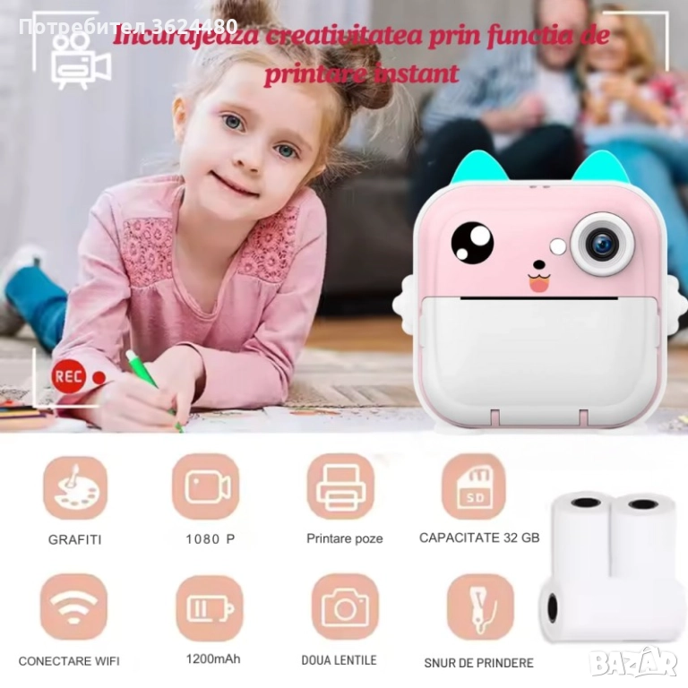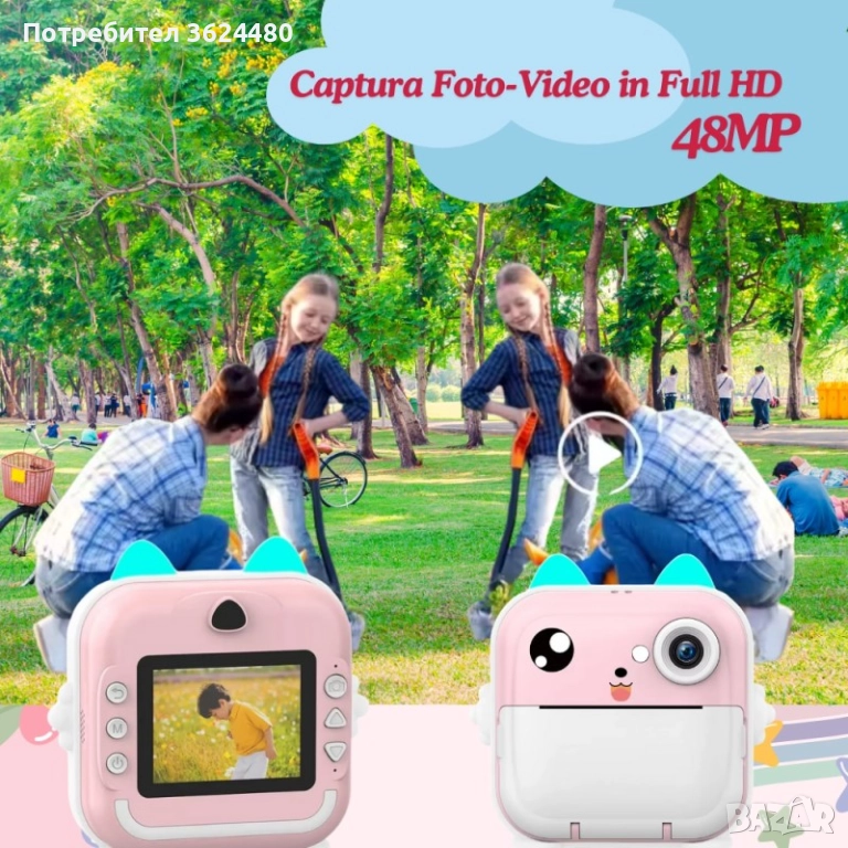 Представяме Ви Детския фотоапарат с моментален печат – перфектният подарък за малки творци! Този многофункционален уред комбинира снимане, видеозаснемане и незабавен черно-бял печат без мастило. С двойна камера (предна и селфи) и впечатляваща резолюция от 24 мегапиксела, децата могат да запечатват всеки момент. Дизайнът "Коте" с ергономична форма е идеален за детски ръце. Фотоапаратът разполага с MP3 плейър, вградени игри и Bluetooth за лесно прехвърляне на файлове чрез приложението FUN PRINT.