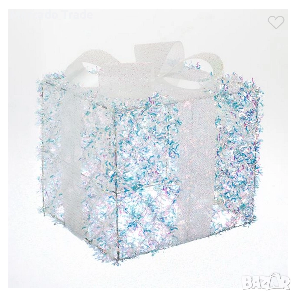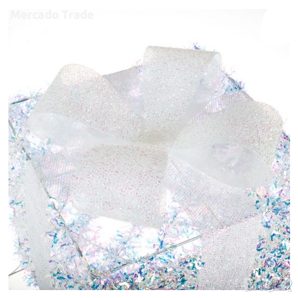 Коледен светещ декоративен подарък с бяла холографска тензух и бяла панделка.