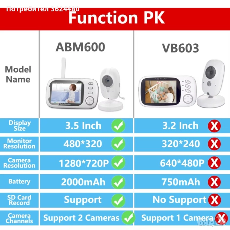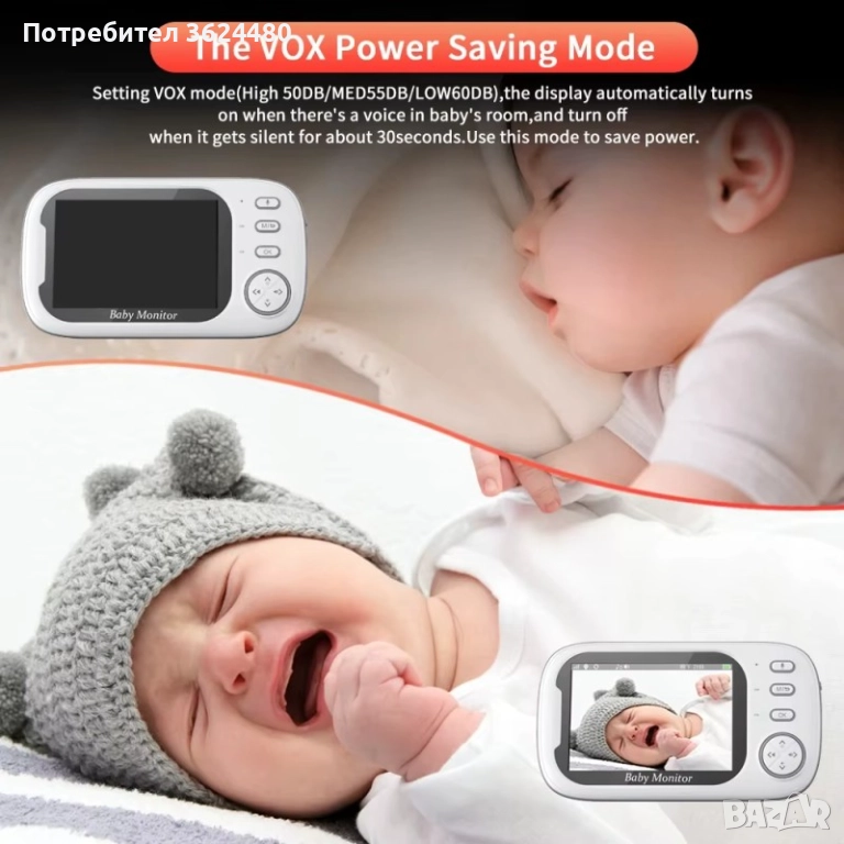 Захранване: Мониторът се захранва от 2000mAh акумулаторна батерия, а комплектът включва два 3-метрови захранващи кабела за лесно позициониране на камерата.